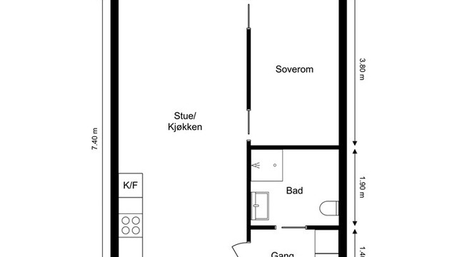 3. etasje 42 kvm: Stue/kjøkken, soverom, gang og bad