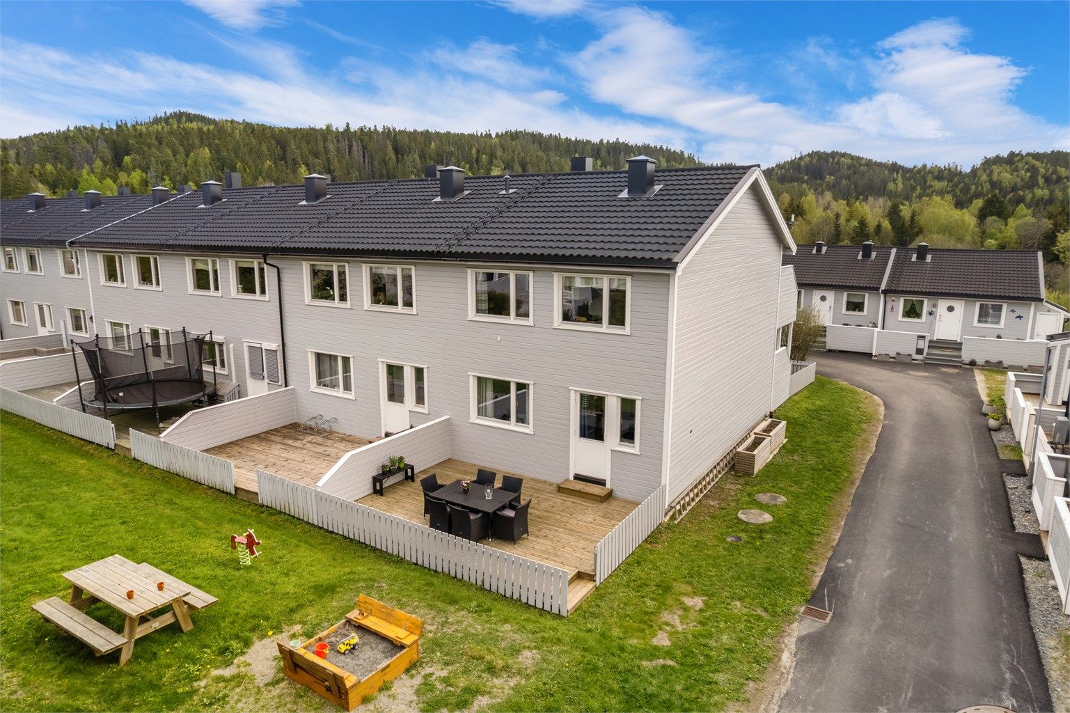 Velholdt enderekkehus med flott intern beliggenhet. Stor og solrik uteplass med utsikt! Nær skole og marka. Garasje.