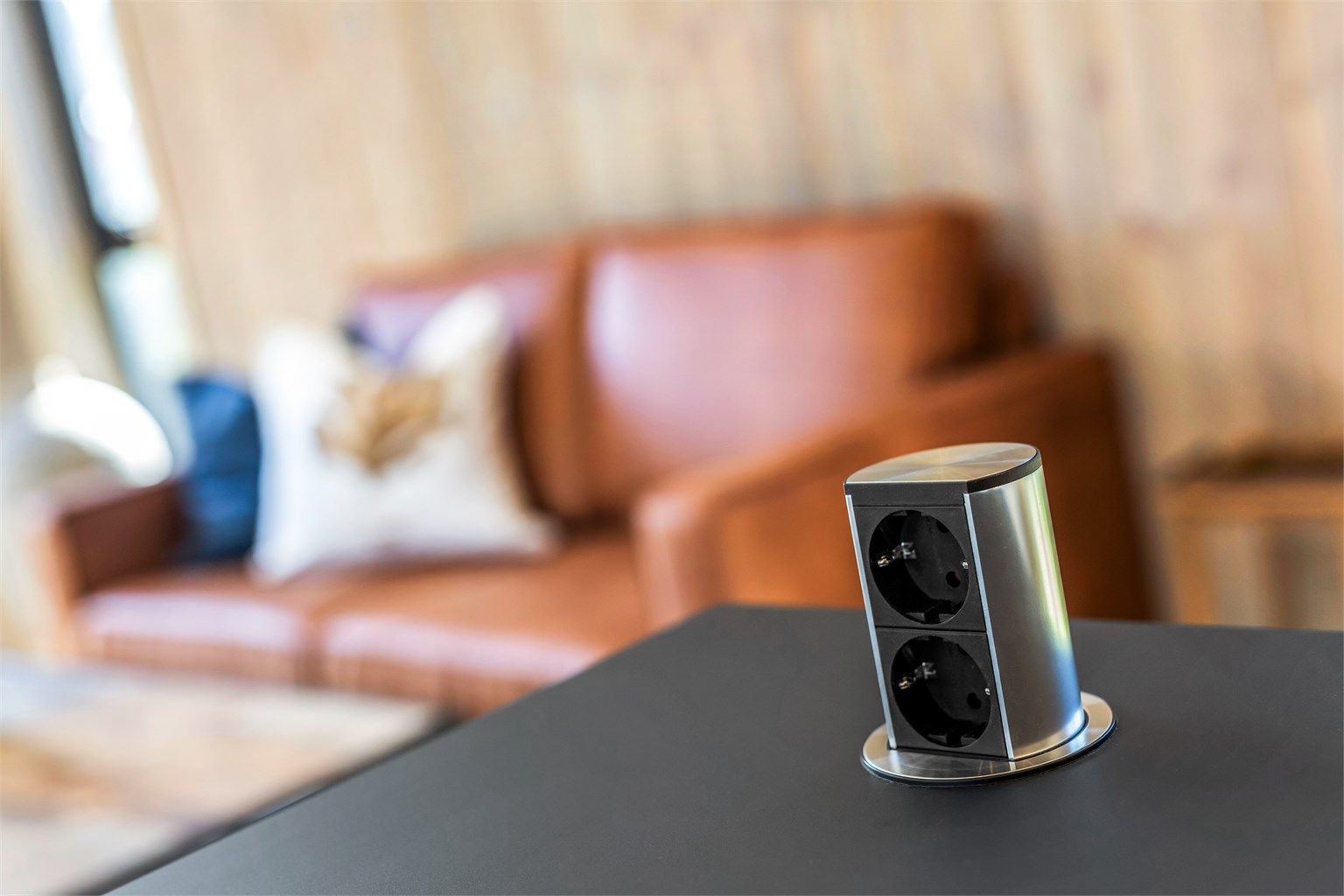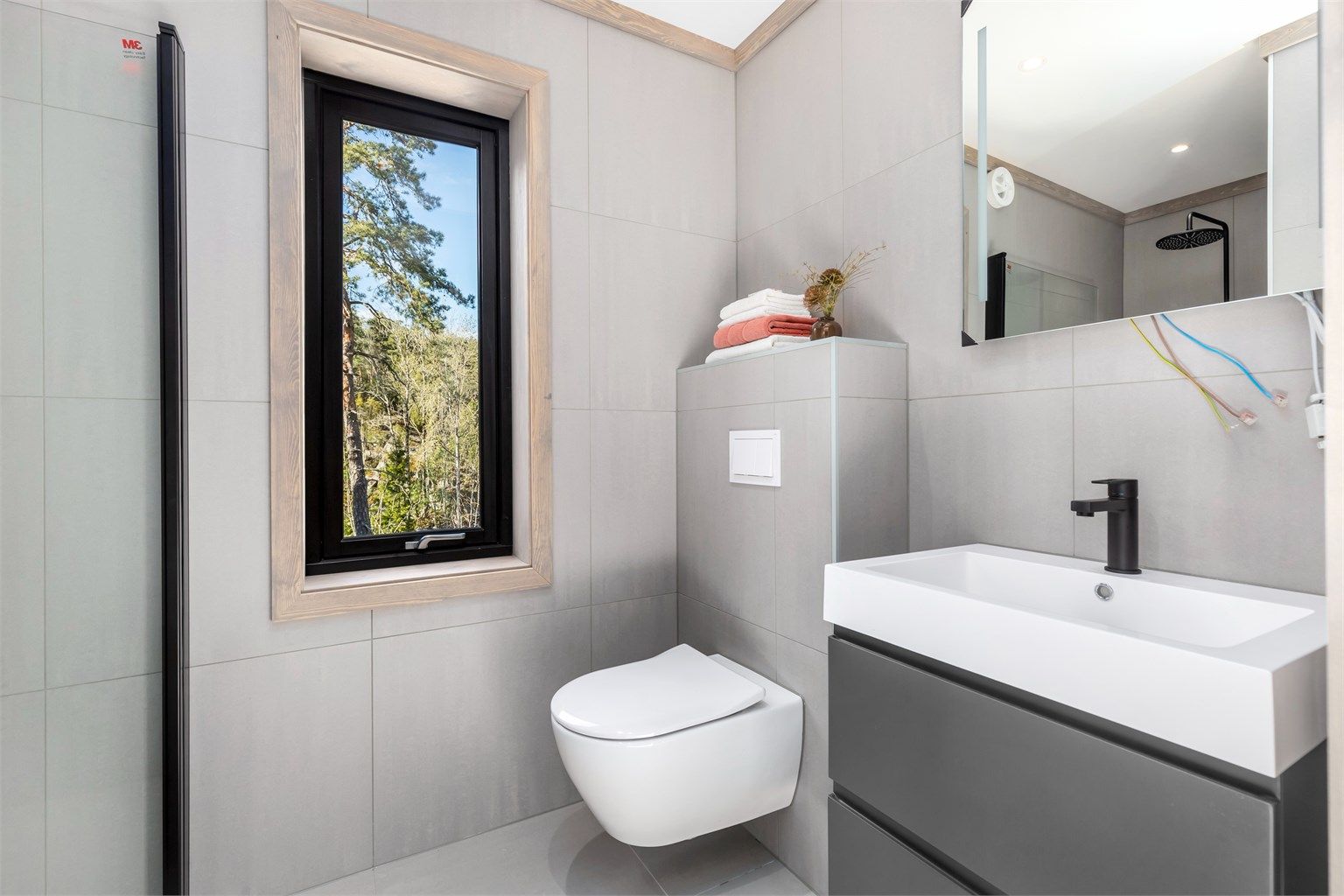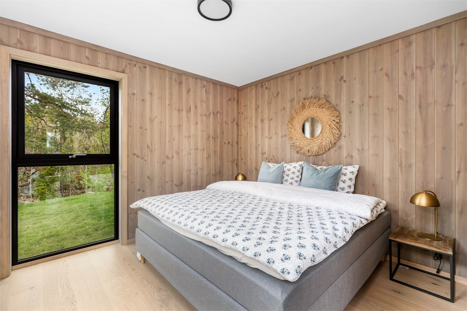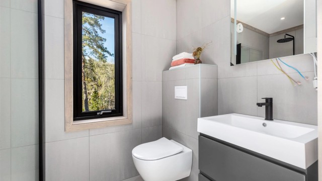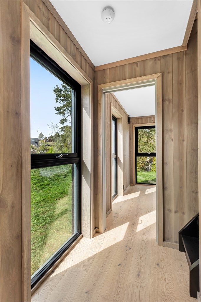 Hytta har en gjennomført nordisk stil med 1-stavs eikeparkett i Rustic white og matchende gulvflis på bad og i gangen. Vegger med slett panel er beiset og himlingene har malte gipsplater. Kjøkkenet med slette fronter i sort, står fint til interiøret for øvrig med bl.a. sorte el-kontakter og brytere. En kjøkkenøy i tillegg til innredning med overskap gir godt med skap, skuffer og benkeplass, samtidig som den danner et naturlig skille mot stua. Kjøkkeninnredningen er fra Systemkjøkken og har integrert komfyr med induksjonstopp og komfyrvakt. Oppvaskmaskin, kjøl-, og fryseskap. Sort armatur fra Tapwell. Det lille kjøkkenet i annekset er i samme utførelse og har vask og kjøleskap. Flislagte bad med servant i seksjon, wc med innebygget cisterne og dusjnisje med stort dusjhode og hånddusj også her er armatur i sort utførelse. Opplegg til vaskemaskin i egen nisje på badet.