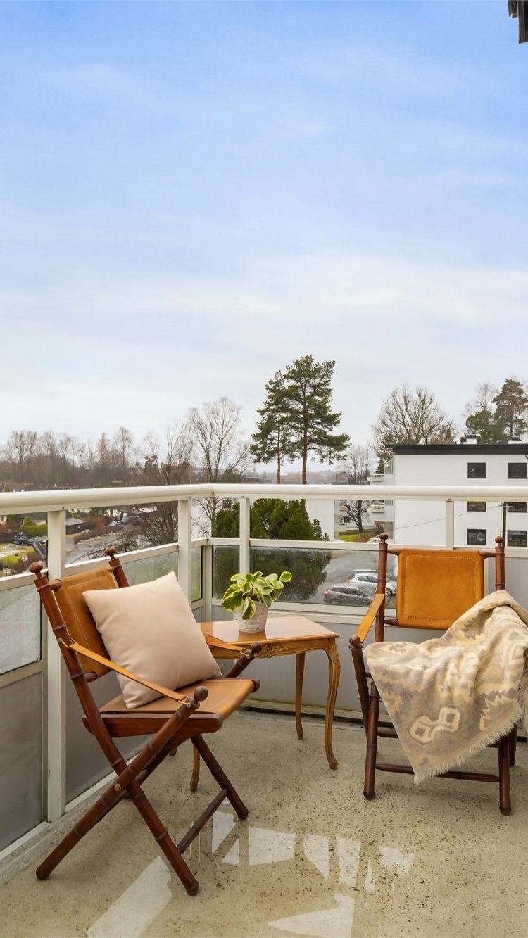 Fra stuen har du utgang til en generøs balkong på 10 m². Balkongen er utført i betongkonstruksjoner med et rekkverk av metall og plater, og er utstyrt med en markise som gir fleksibel solskjerming.
