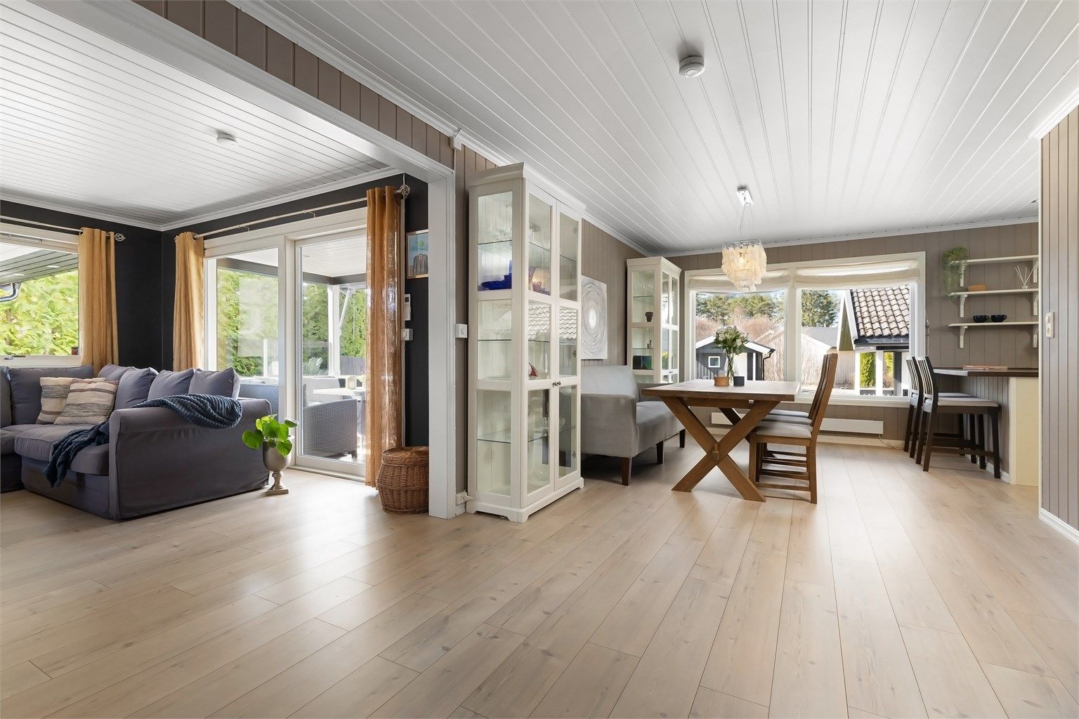 Flott enebolig over ett plan, i tillegg til kjeller. God planløsning med blant annet tre gode soverom, flislagt bad, toalettrom, praktisk vaskerom, innholdsrikt kjøkken med barløsning, romslig spisestue med vedfyring og stue med utgang til en lun overbygd terrasse. Boligen har en romslig endetomt som er pent opparbeidet med hage, gruset innkjørsel og belegningsstein. her finner man også dobbelgarasje med elbil lader, elektrisk port og anneks.