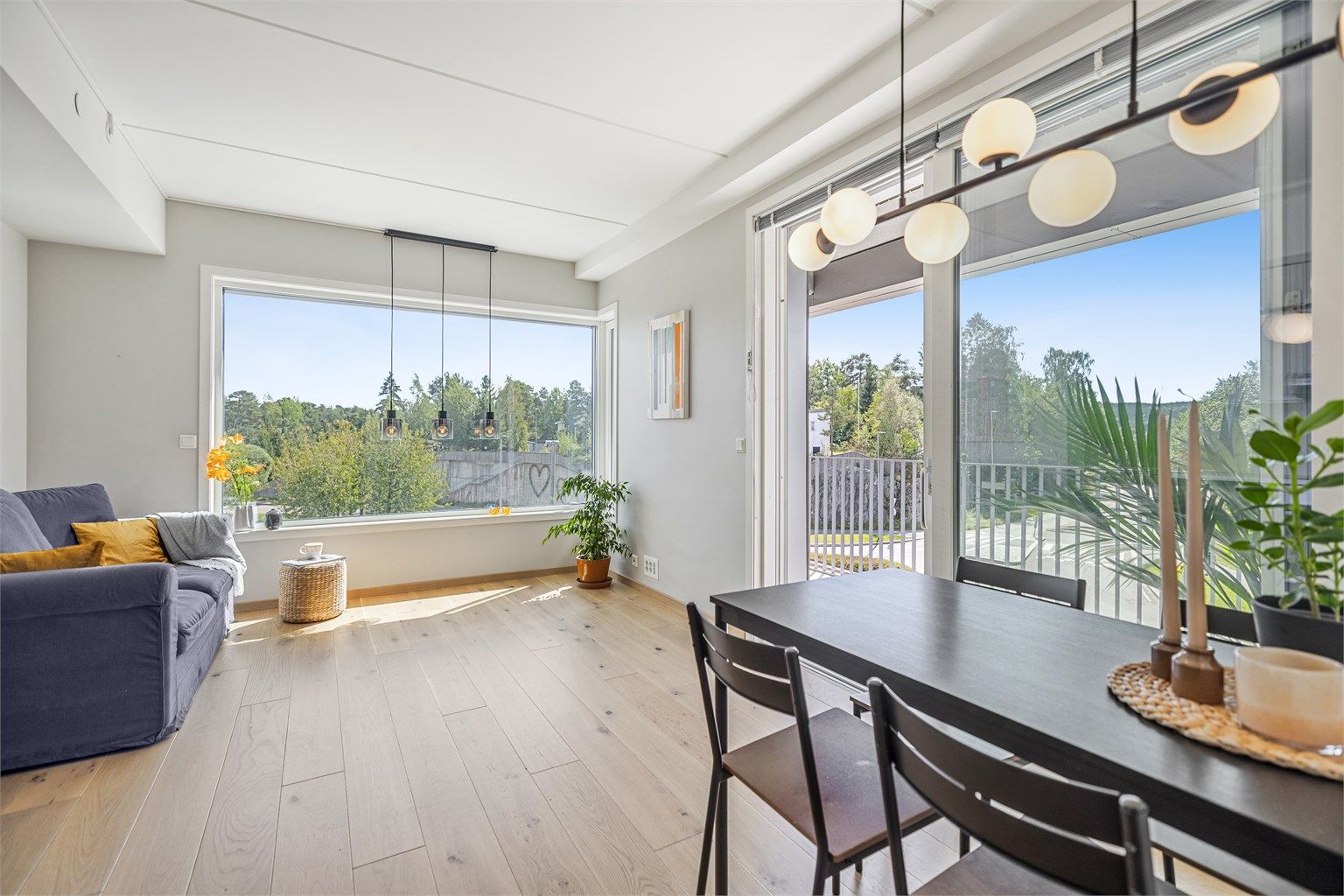 Lys og trivelig stue med god plass til både sittegruppe og spiseplass. Det er store vindusflater som slipper inn rikelig med naturlig lys, og den usjenerte, høytliggende beliggenheten skaper en rolig og avslappende atmosfære. I tillegg bidrar et hjørnevindu med lysinnslipp fra to retninger til en luftig og åpen romfølelse.
