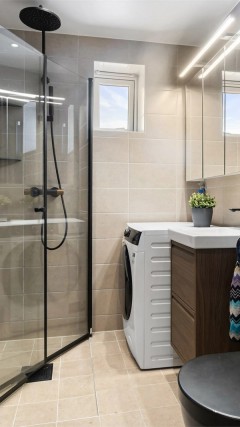 - Renovert bad, utført av faglært (VBM BYGGFORNYELSE AS) i forbindelse med borettslagets våtromsprosjekt. Samsvarserklæring foreligger.