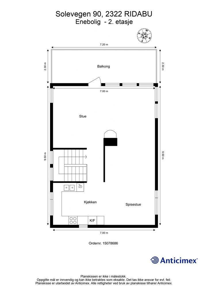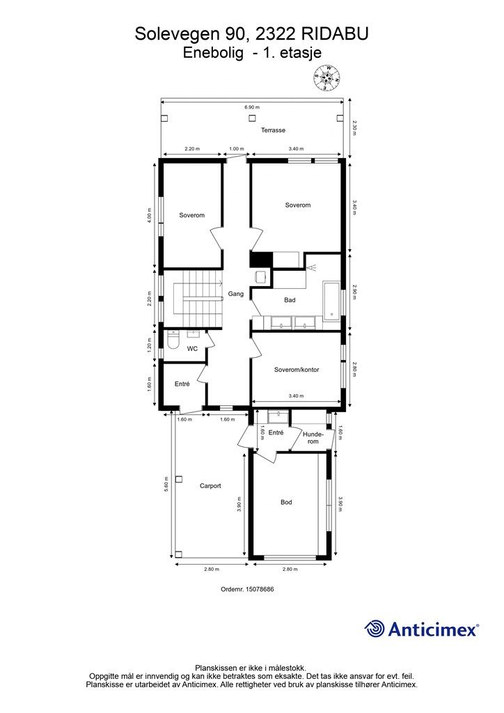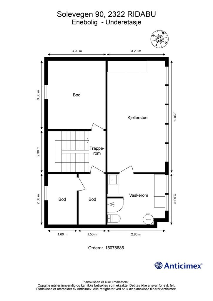 Vedlagte plantegninger er ikke målbare. De oppgitte arealer er hentet fra rapport med befaringsdato 02.02.2026 utført av Anticimex v/Karl Even H. Brukvangen. Arealene er beregnet og rom er definert etter dagens faktiske bruk, uavhengig av hva som er godkjent av bygningsmyndighetene.