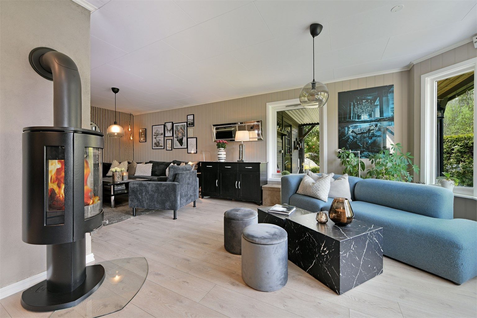 Boligen er over to plan og inneholder bl.a. 2 romslige stuer, kjøkken (2015), 2 bad (ett oppusset 2014) og 3 rom benyttet som soverom (ett av rommene ikke godkjent til varig opphold)