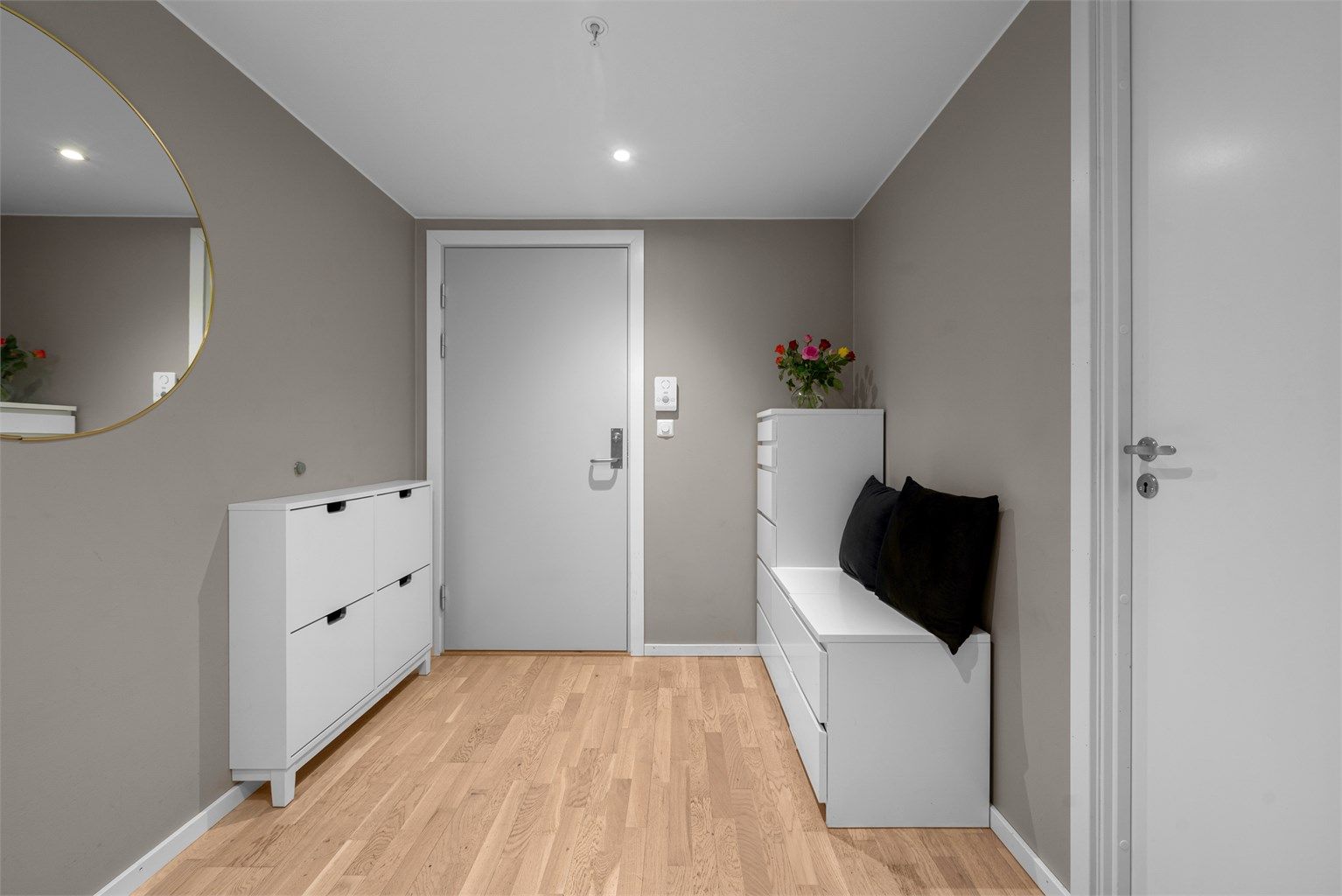 Leiligheten har moderne løsninger, funksjonell planløsning og er holdt i nøytrale farger på både overflater og innredninger. Fra stuen er det direkte utgang til stor og innglasset terrasse på ca. 14 kvm med optimale solforhold - rolig og tilbaketrukket beliggenhet i akkurat passe avstand fra sentrum. Gjennomtenkt bygg med høy bokvalitet, energieffektive fasiliteter med vannbåren varme og balansert ventilasjon. Heisadkomst og etasjeskiller av betong. Innglasset terrasse på ca. 14 kvm.