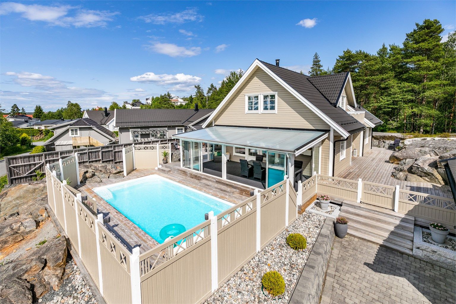 Høytliggende enebolig med herlige utearealer; vinterhage og basseng inkludert. Lader i garasje, varmekabler i oppkjørsel