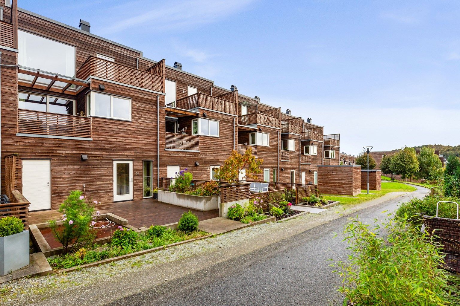 Boligen ligger i et område som er perfekt tilrettelagt for alle aldersgrupper og uten gjennomgangstrafikk. Det er hageflekker ved begge inngangene i tillegg til solrike balkonger, så boligen har godt med uteplasser både på fremsiden og baksiden av huset.