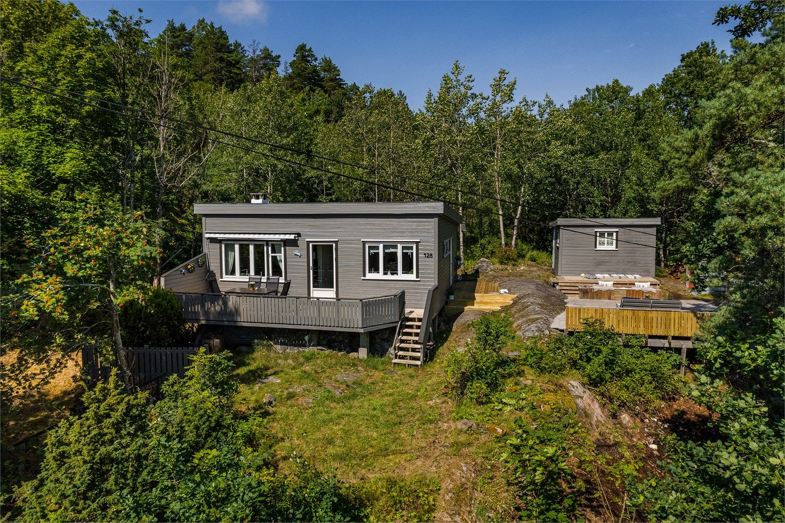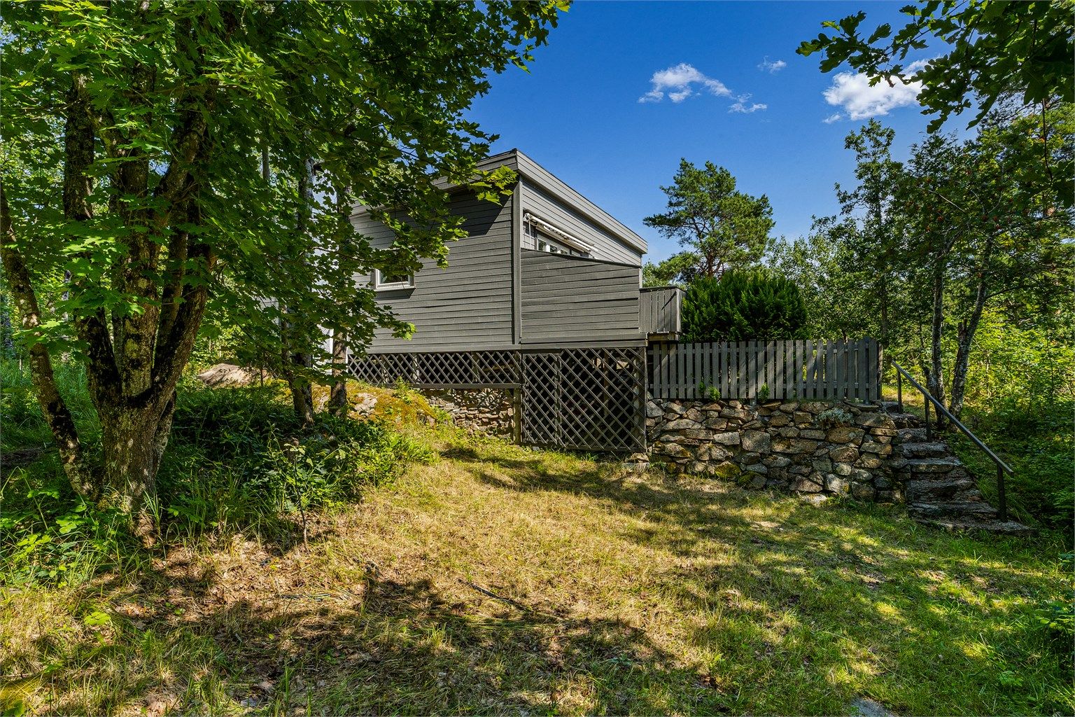 Hytta ligger usjenert til omgitt vegetasjon og med fin utsikt utover Mørjefjorden.