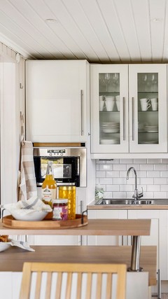 Følger med salget: Integrerte hvitevarer (kjøleskap, fryseskap, oppvaskmaskin, platetopp, komfyr, mikrobølgeovn og ventilator).