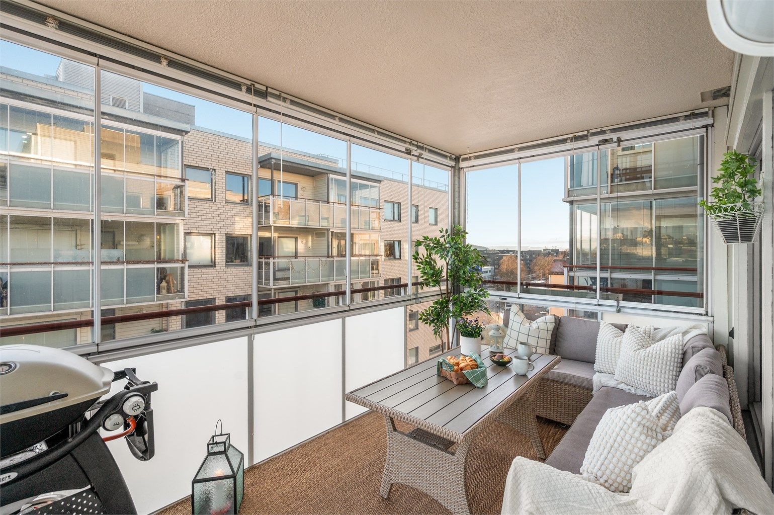 Solrik, innglasset balkong på 12 kvm med fint utsyn