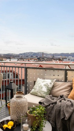 På denne usjenerte og solrike balkongen kan man nyte lange, varme sommerdager. Vendt syd har man sol store deler av dagen. Med 8 kvm å boltre seg på er det plass til å innrede med en hyggelig sittegruppe.