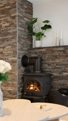 - Elementpipe fra byggeår. Peisovn med glassdør i stue.