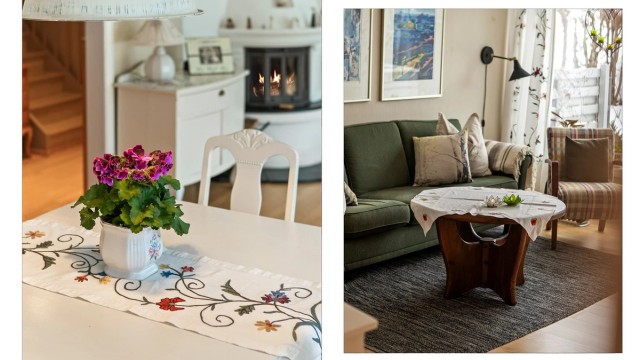 * Boligen er lys og pent innredet med parkett/laminat på gulv, lysmalte flater/tapet og flislagt bad med varmekabler