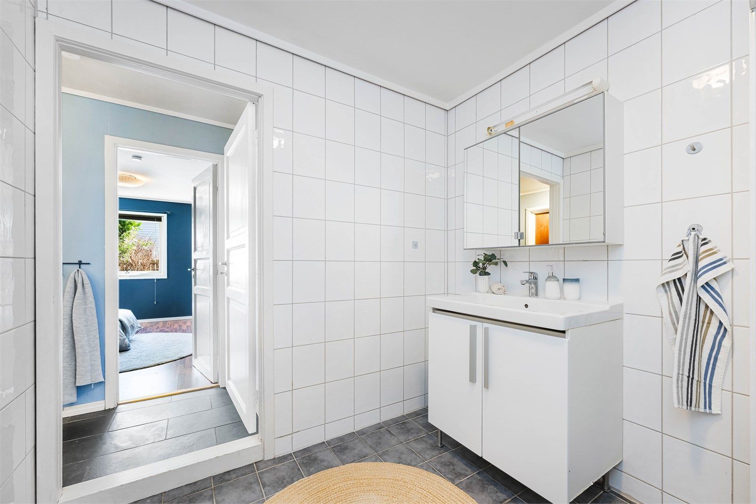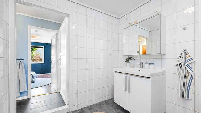 Fliser på bad, ellers malte veggflater.