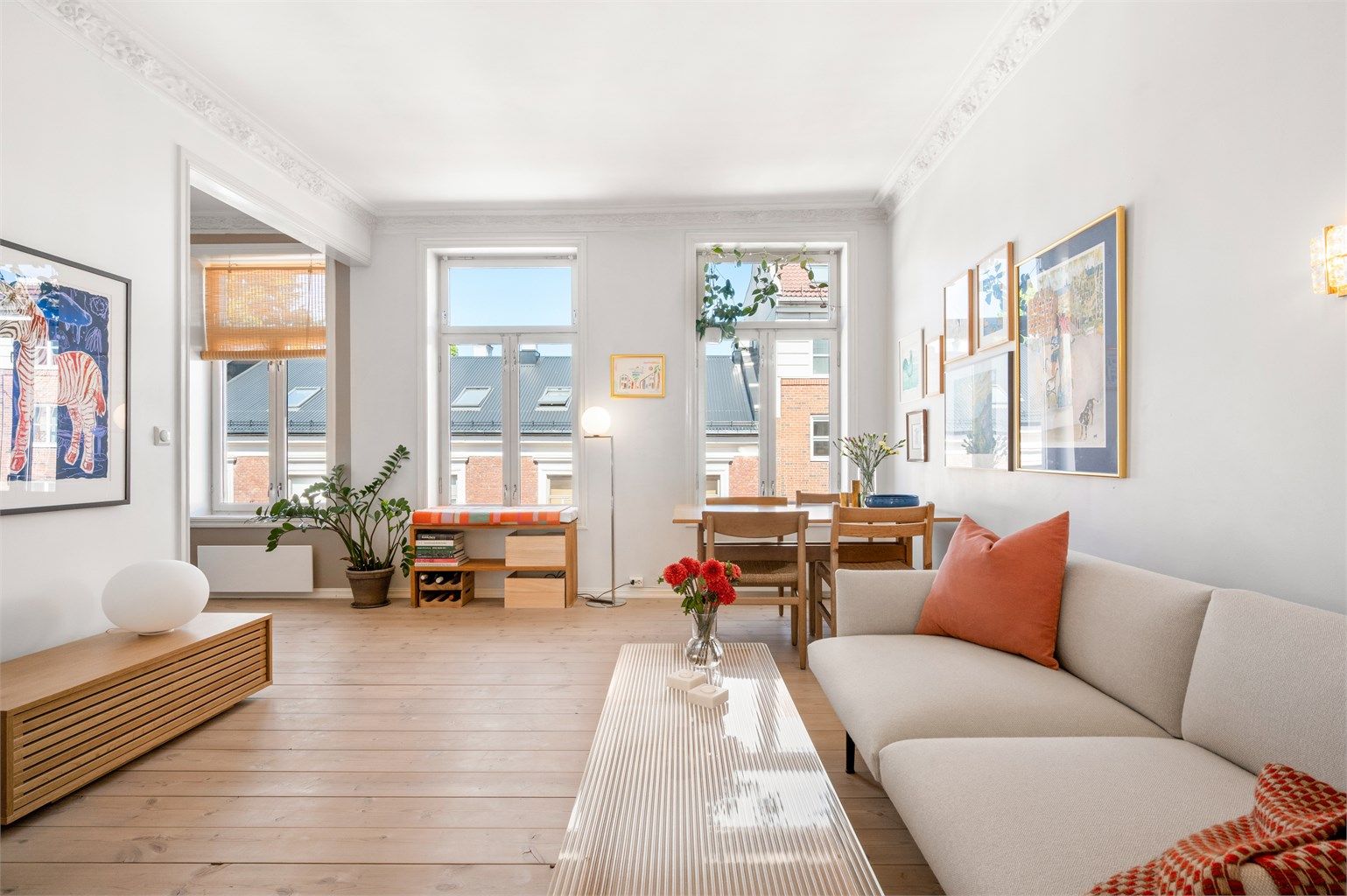 Klassiske detaljer med god takhøyde, stukkatur og tregulv