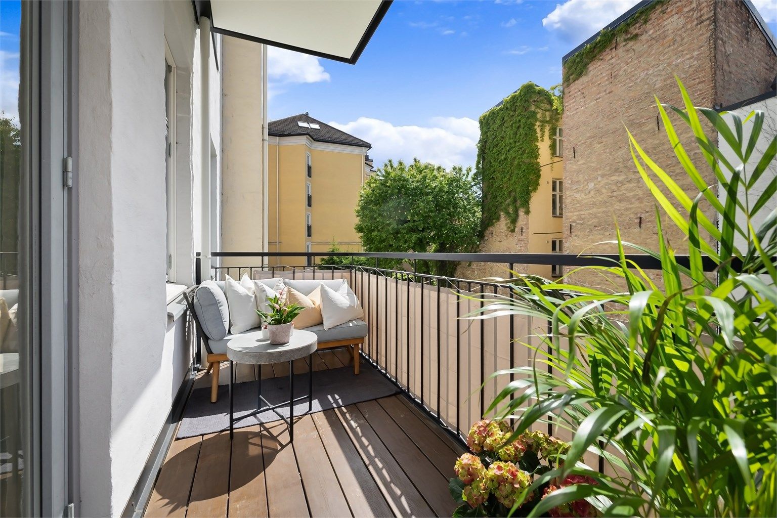 En klassisk og innholdsrik selveierleilighet med to solrike balkonger og en nydelig peisinnsats i stue. Leiligheten har en gjennomgående planløsning med store vindusflater, generøs takhøyde og nydelige, originale detaljer. Videre har boligen en åpen stue- og kjøkkenløsning med et klassisk og påkostet snekkerbygget kjøkken, tre soverom, hvor alle vender mot rolig bakgård, og et delikat baderom samt separat toalettrom.