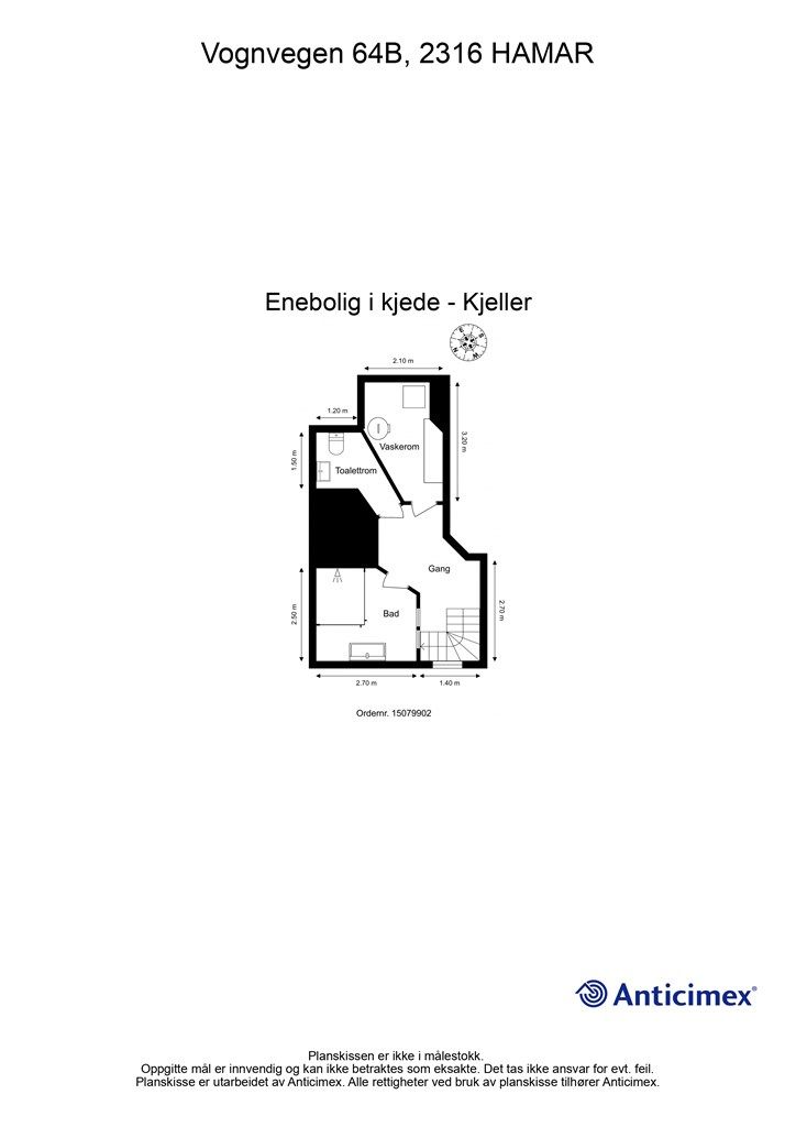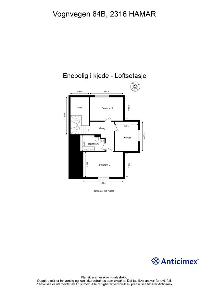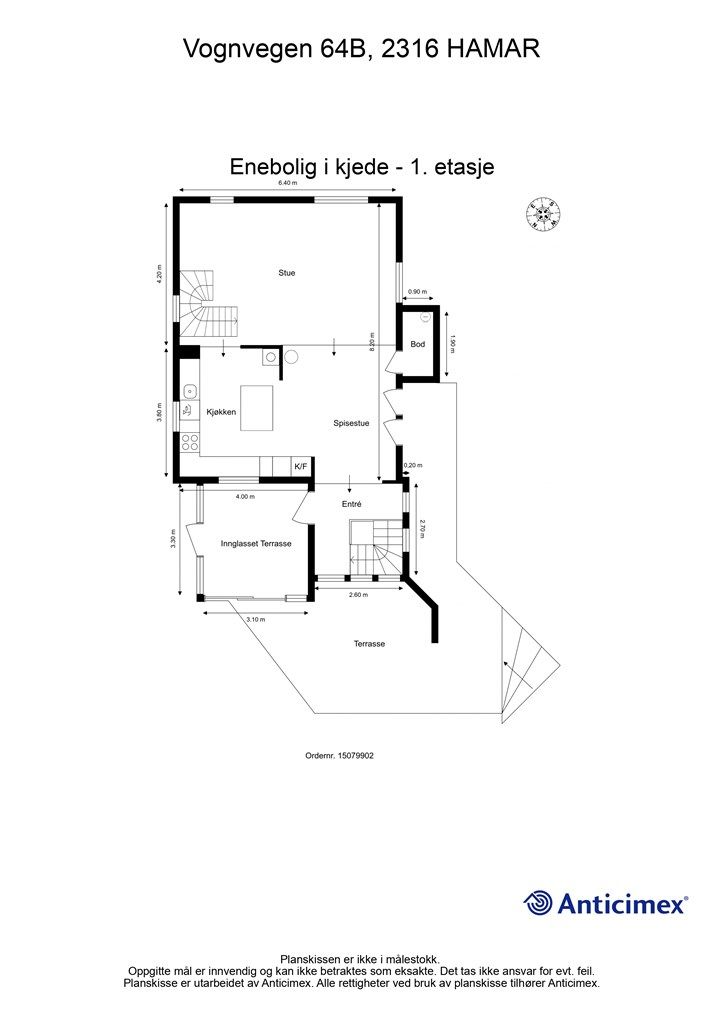 Vedlagte plantegninger er ikke målbare. De oppgitte arealer er hentet fra rapport med befaringsdato 06.03.2026 utført av Anticimex AS v/Marius Rognstad. Arealene er beregnet og rom er definert etter dagens faktiske bruk, uavhengig av hva som er godkjent av bygningsmyndighetene.
