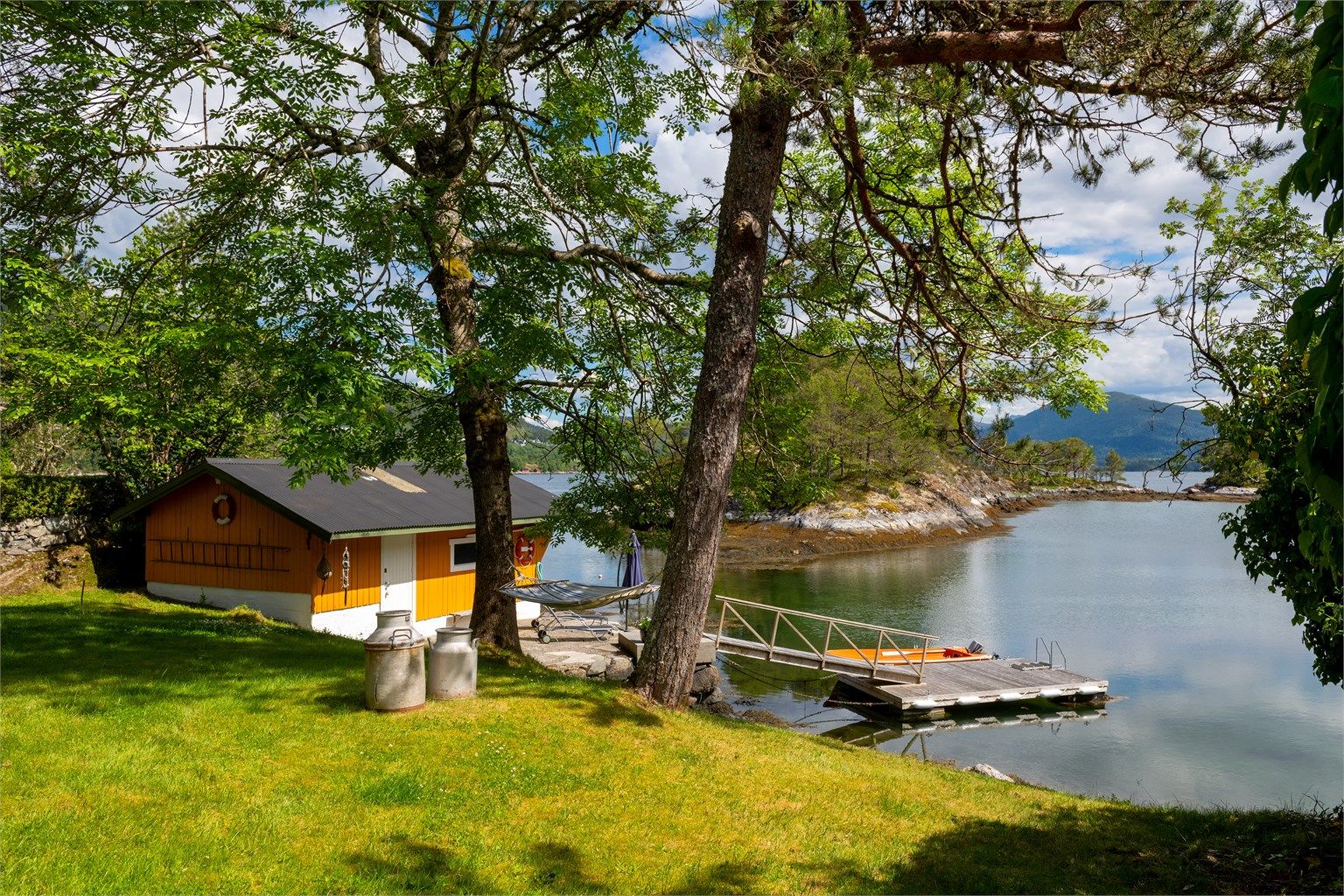 Idyllisk beliggende fritidseiendom med stor eiendomstomt. Eiendommen består av flere bygninger, hytte, naust, uthus, utedo og flytebrygge. Beliggende på en odde ved Skodjebruene i Skodje