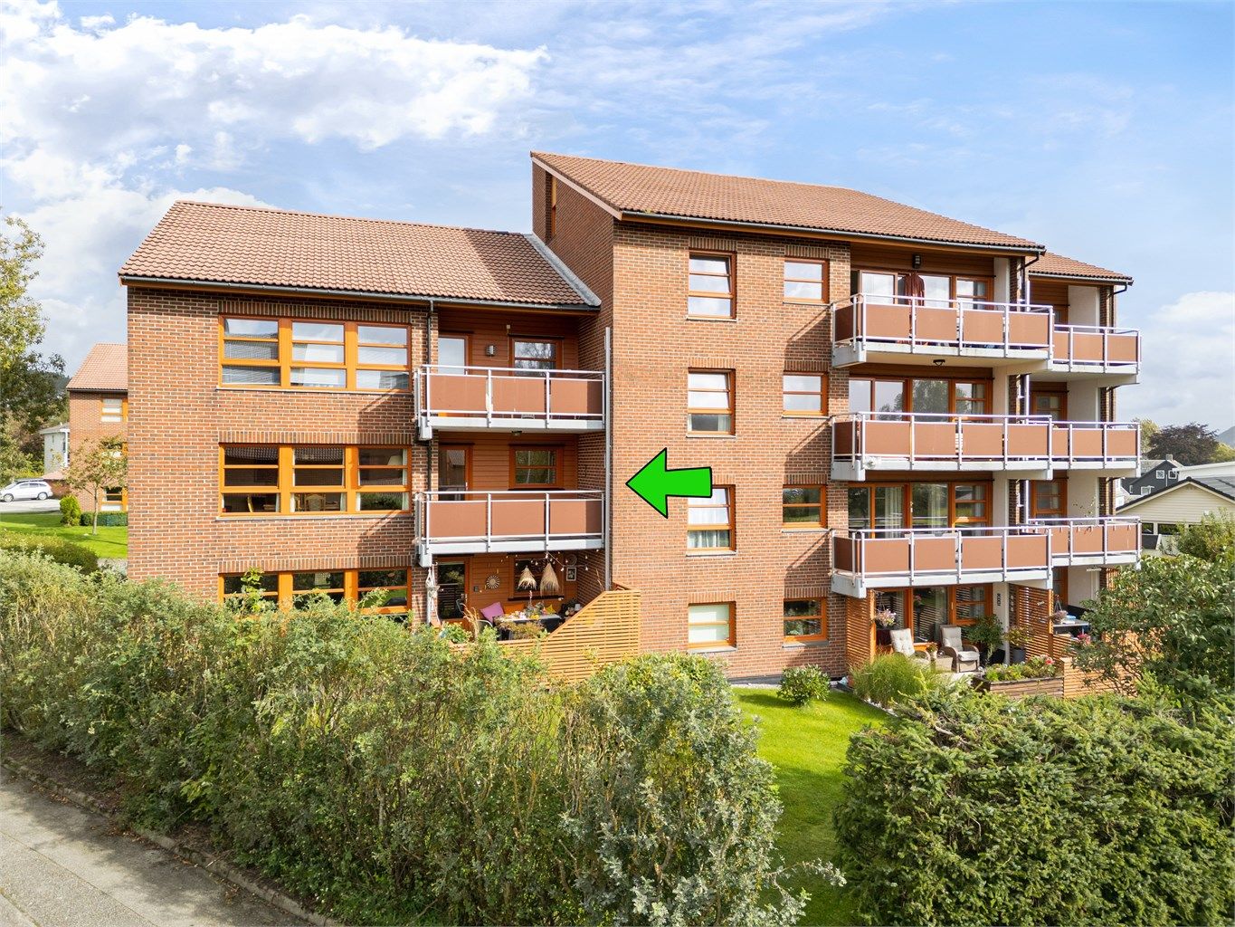 - Solrik balkong med utsyn over grøntareal/fellesareal.