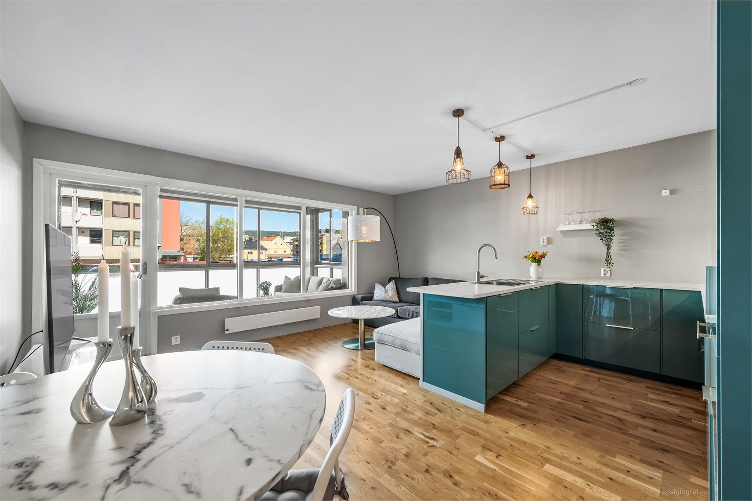 Åpen kjøkken- og stueløsning med utgang til innglasset balkong