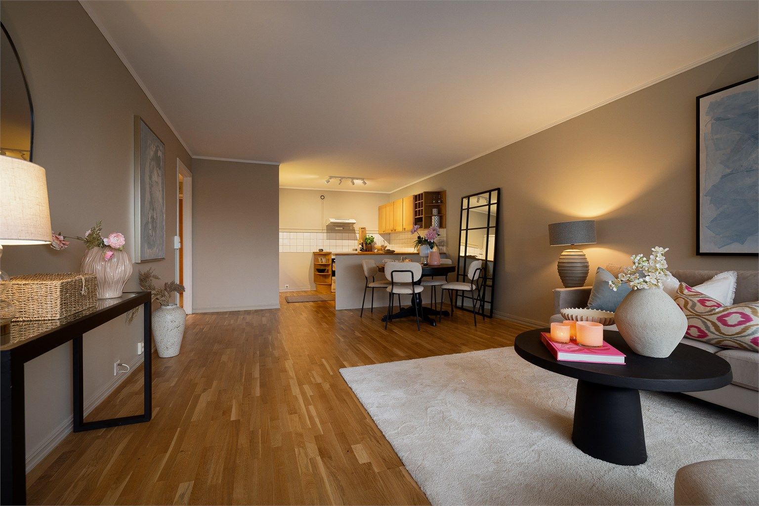 Lys 2-roms med terrasse og garasjeplass – Nymalt i 2025, med en praktisk planløsning og grønn beliggenhet tett på byen.