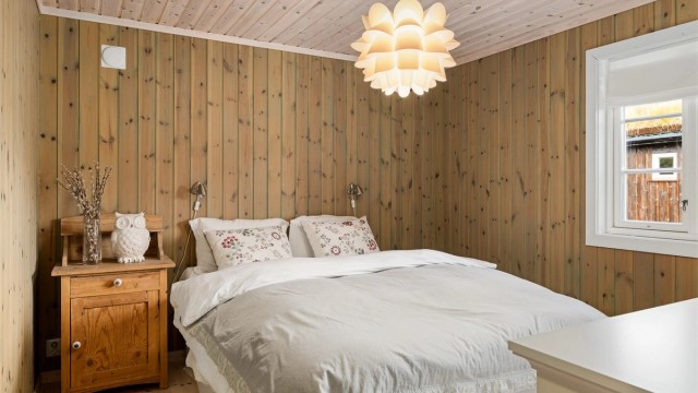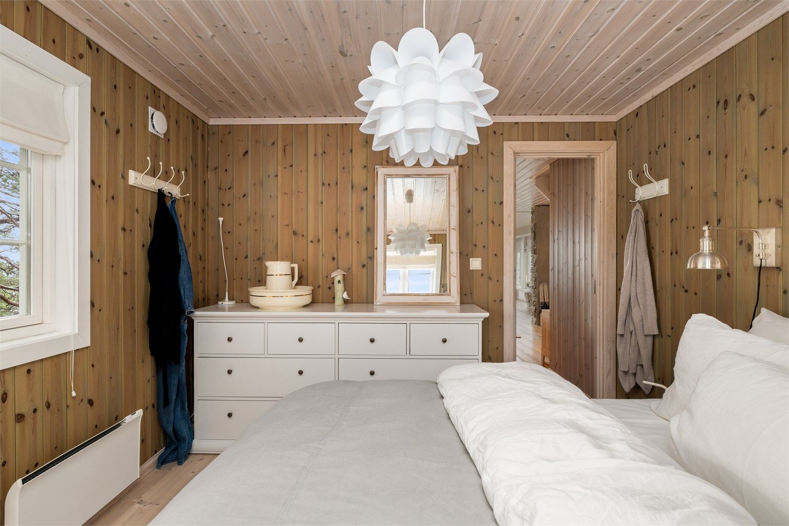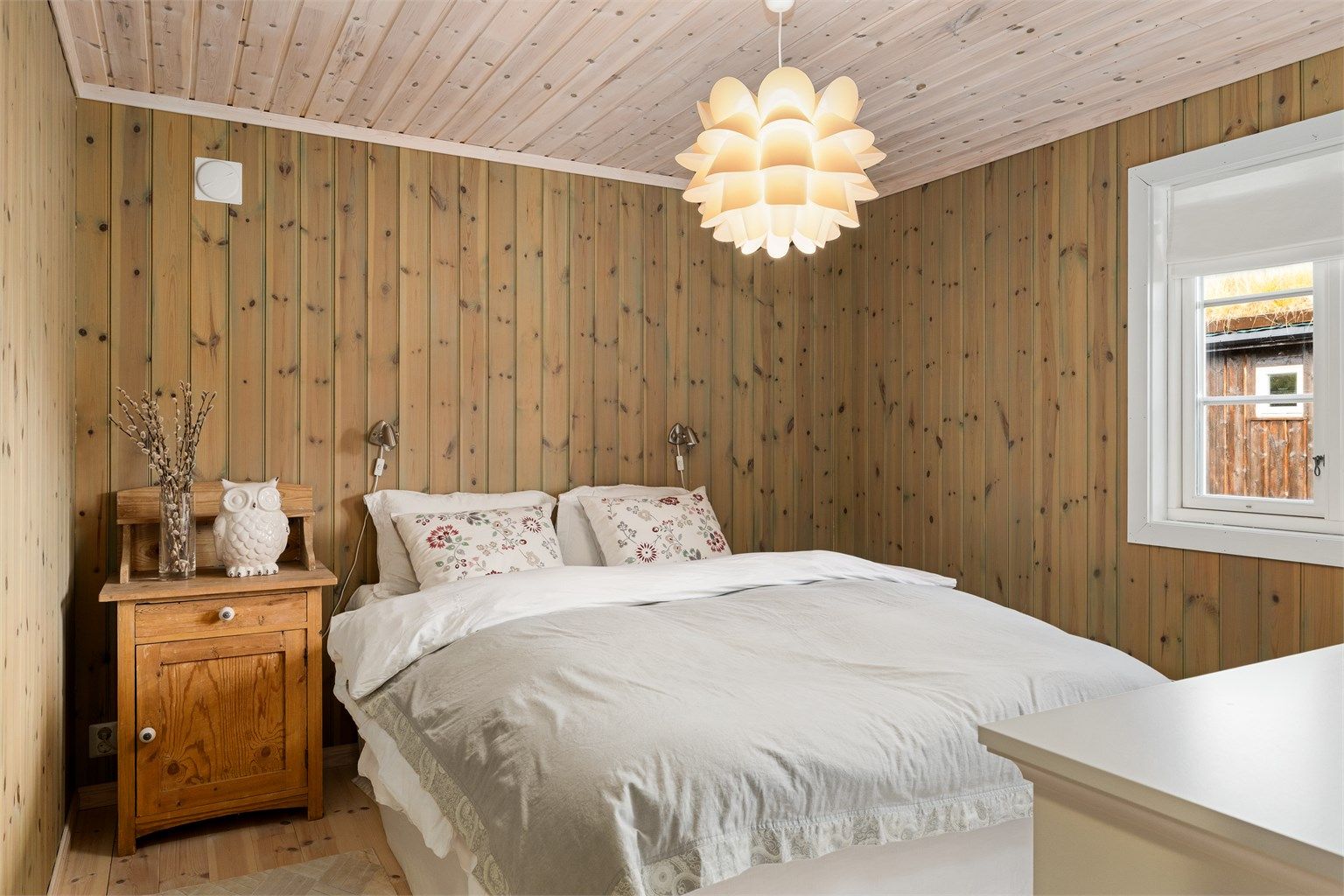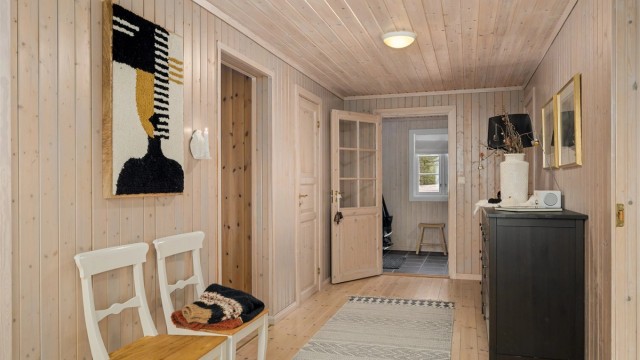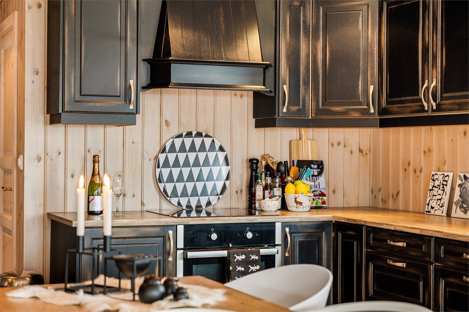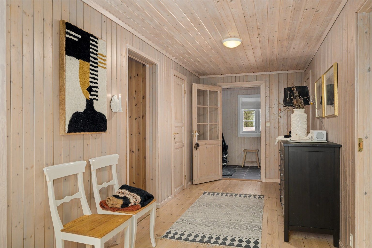 Materialvalg og innredning har en moderne, nordisk stil. Rette linjer, overflater med lyst treverk og flislagt gulv i vindfang, bad og på vaskerommet. Den åpne kjøkkenløsningen gjør måltidene mer sosiale og hyggelige. Innredningen i heltre er malt og er utstyrt med integrert stekeovn, induksjon koketopp og oppvaskmaskin. Badet har wc, servant i seksjon og dusjkabinett. Badet er nylig malt og mellom flis og vegg er det lagt ny våtroms silicon. I tilknytning til badet er det et uinnredet badstue som benyttes til bod. På vaskerommet er det benk med kum. Adkomst til hems via trapp i stua. Hemsen er uinnredet, men det er lagt gulv, så her er det muligheter om man ønsker mer plass. Det er også lagt klart vann og avløp til bod/uinnredet bad om man ønsker å gjøre innrede slik at man får et ekstra bad.