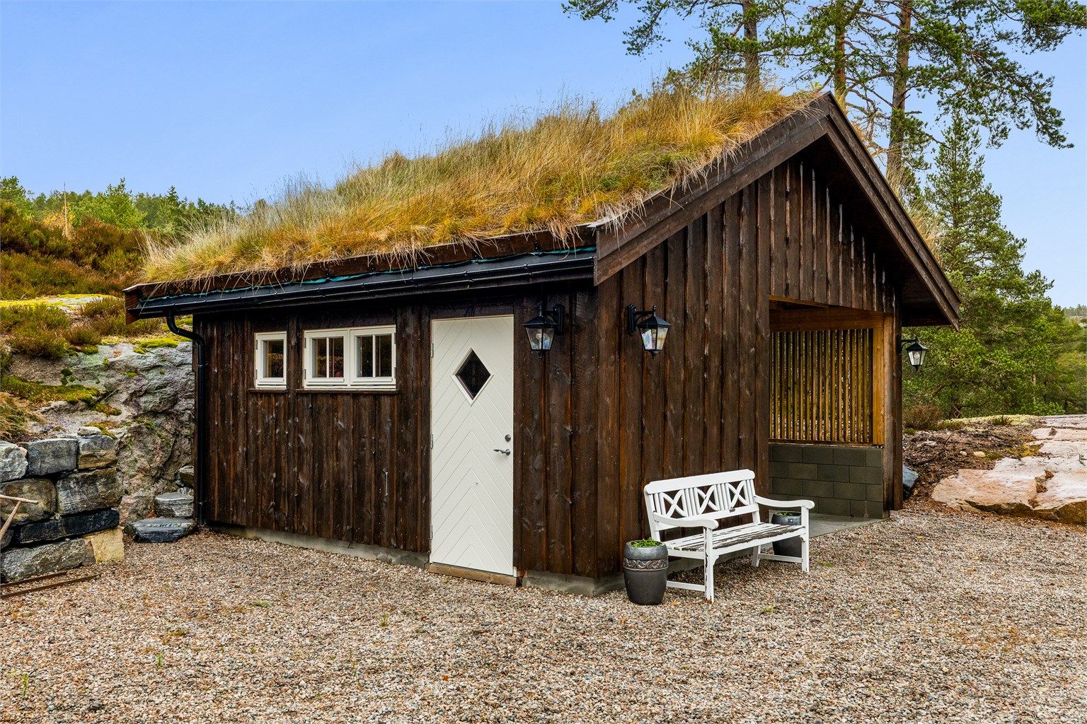 Carport med tilliggende bod og hobbyrom. Stor gruset gårdsplass. Fastmontert lader for EL-bil følger med.