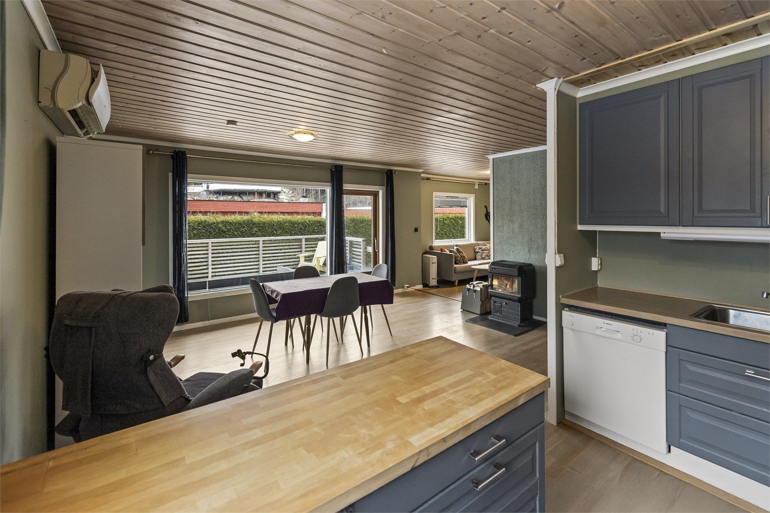 Kjøkkenet er innredet med innredning med profilerte fronter og heltre benkeplate. Kjøkkeninnredningen ble montert brukt i 2022 og fremstår som funksjonell, med gode arbeidsflater og rikelig oppbevaringsplass.