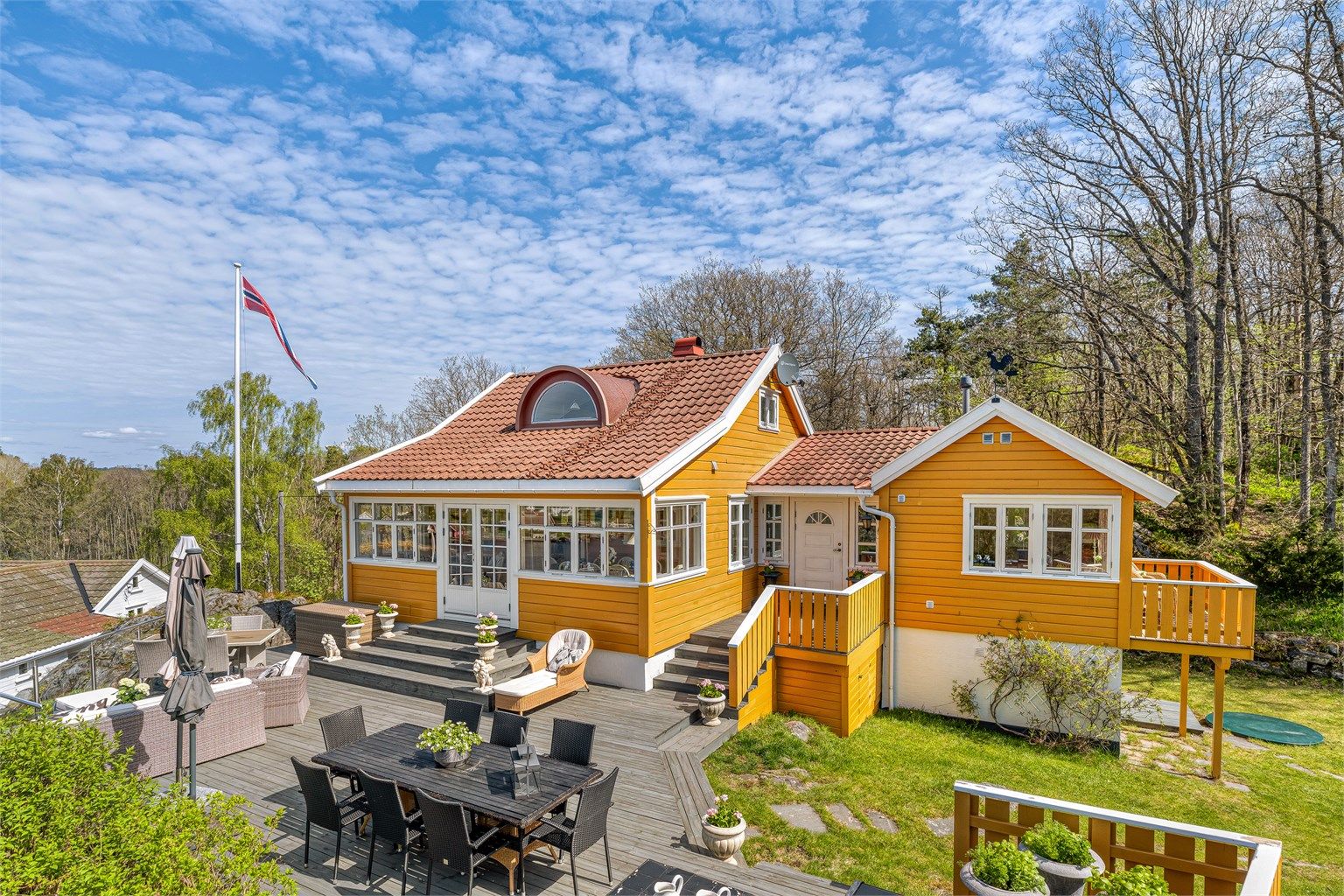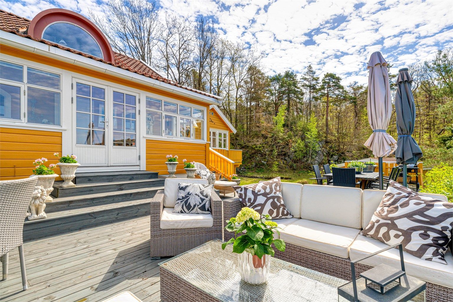 På eiendommen er det flere nydelige terrasser og uteplasser hvor man kan nyte sommeren helt i fred.