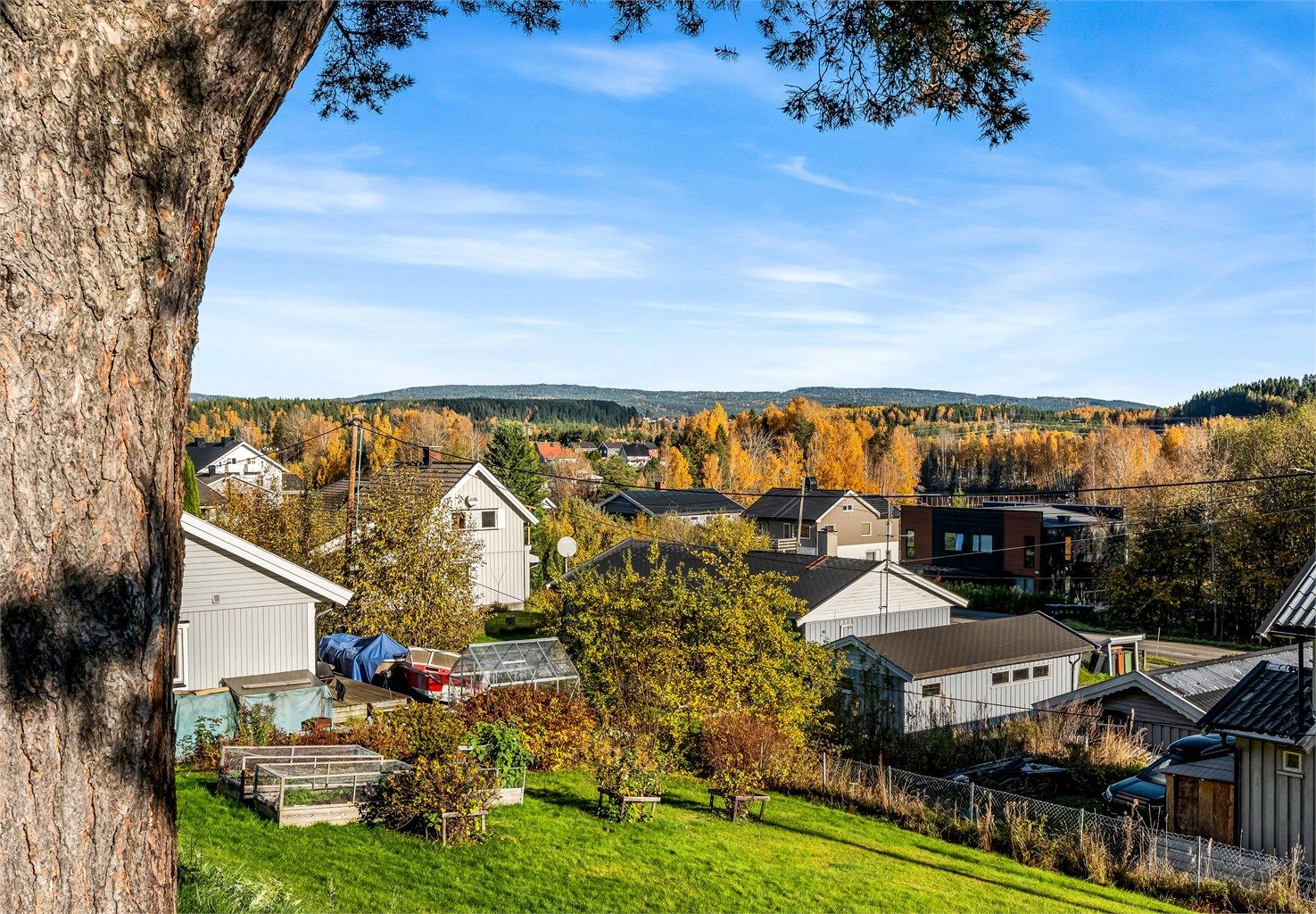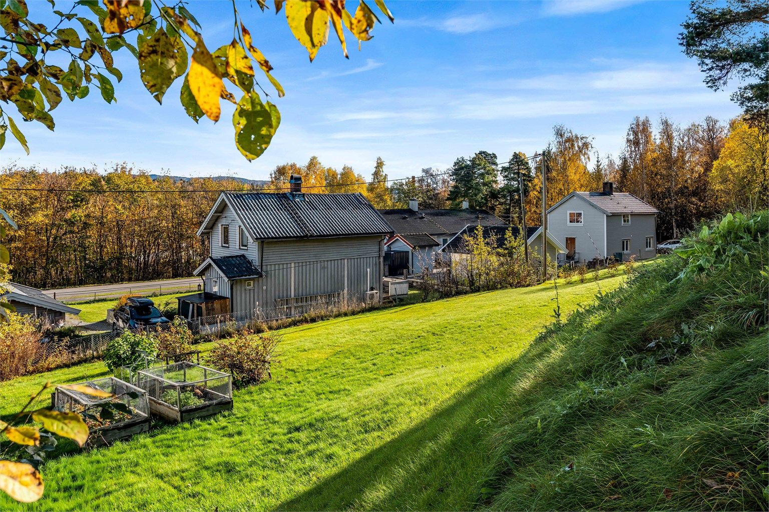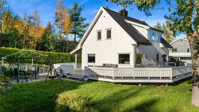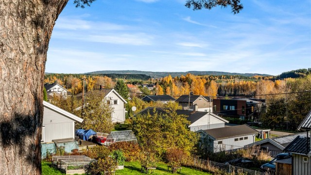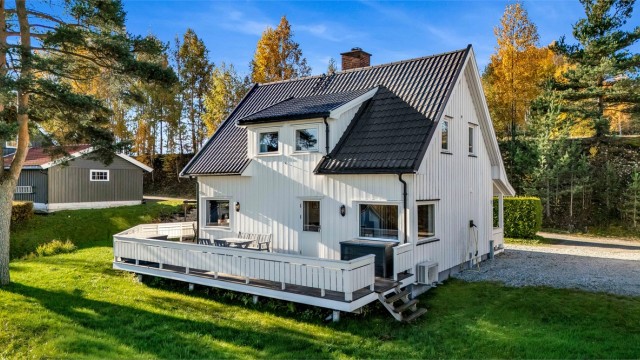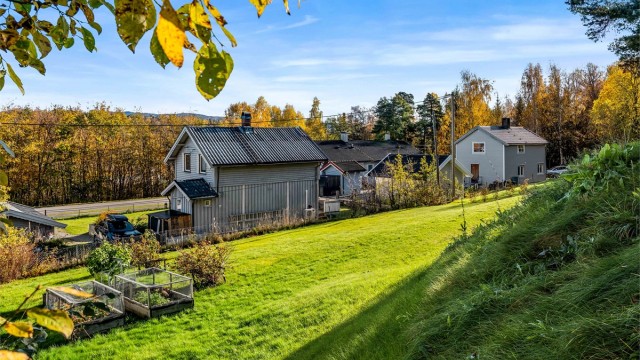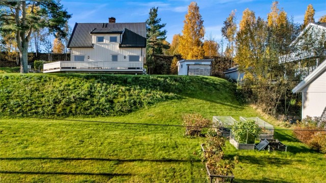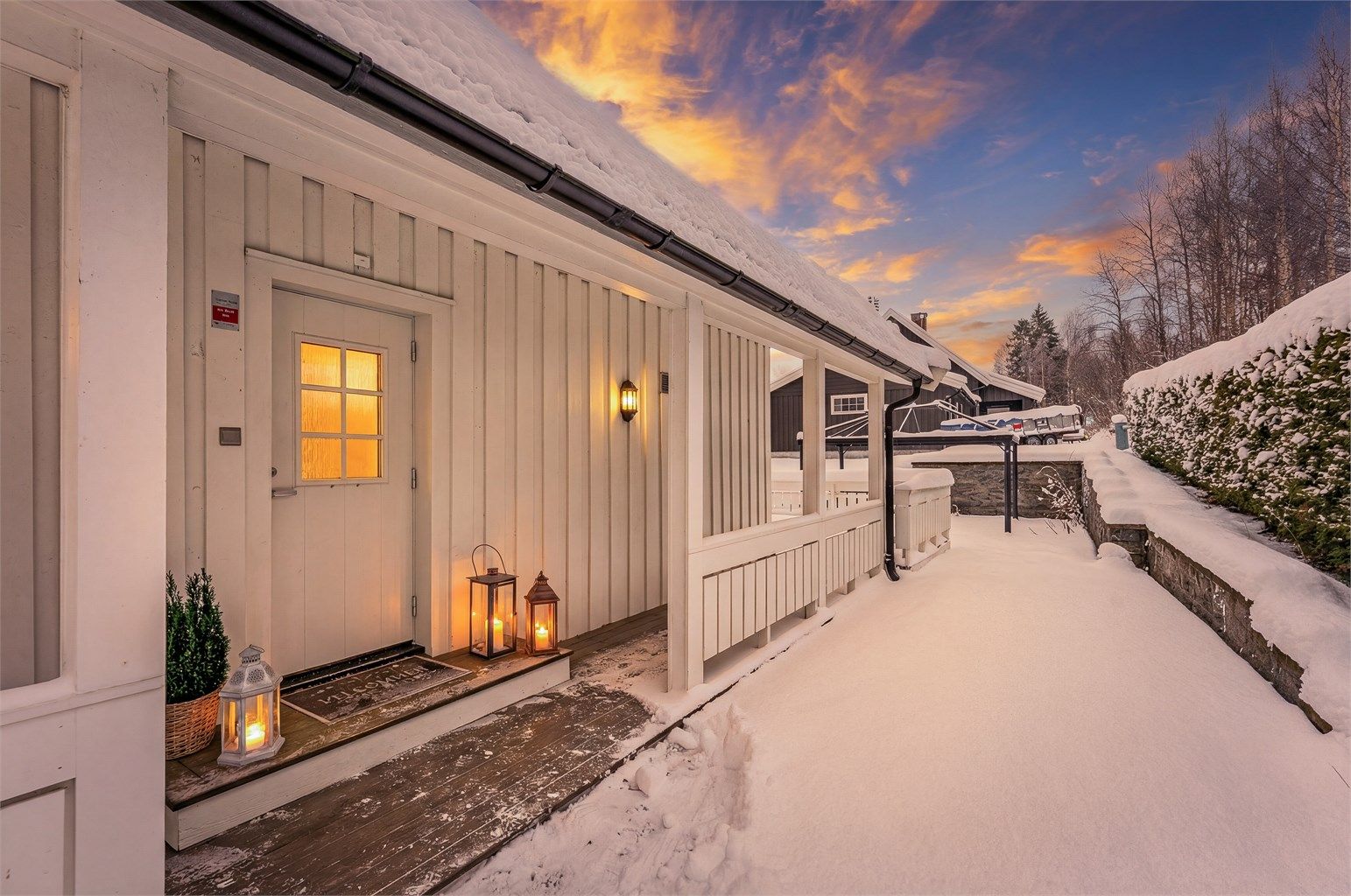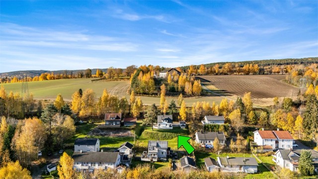 Idyllisk belliggende enebolig m. stor tomt. Landlig og rolig. Gåtur til Sentrum. Solrikt. Ca. 40 min til Sandvika.