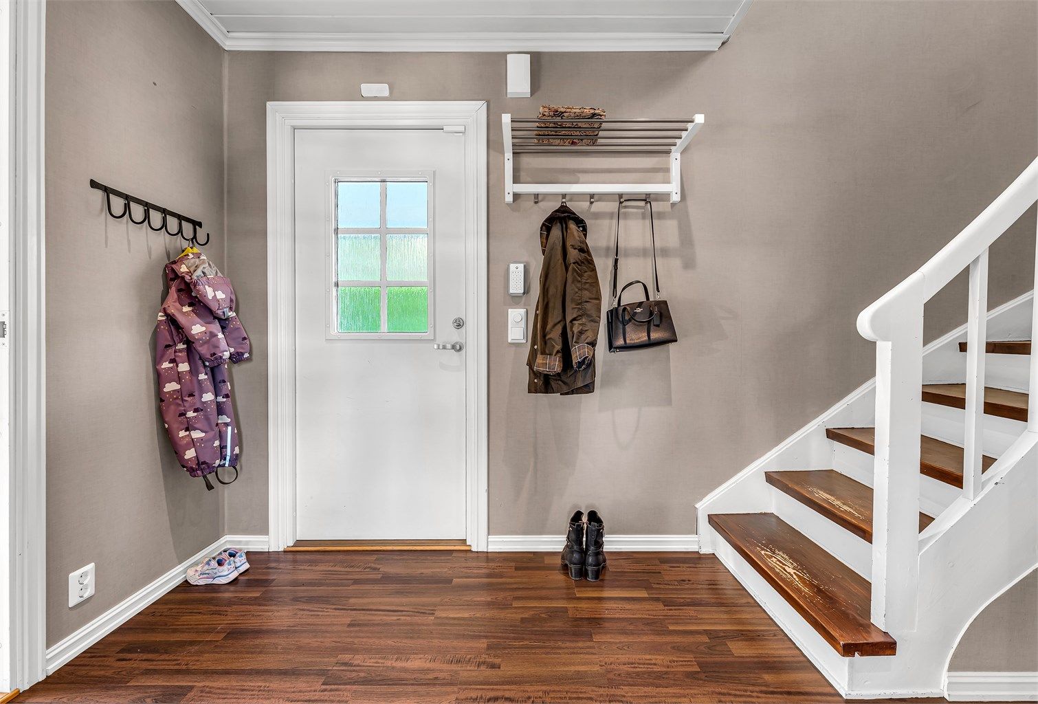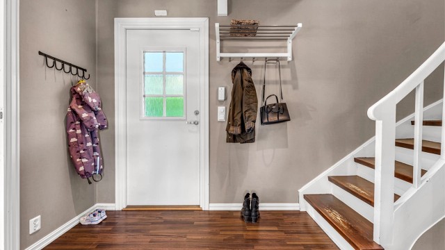 TG3 vurderes da det mangler rekkverk til trapp utvendig og trapp fra 2.etg. og ned til 1.etg. Trapp til kjeller har ingen håndløper eller rekkverk, dette må etableres for å forhindre fall eller skade ved bruk av trappen. For mer informasjon se side 10 i tilstandsrapporten.