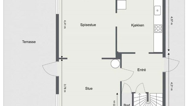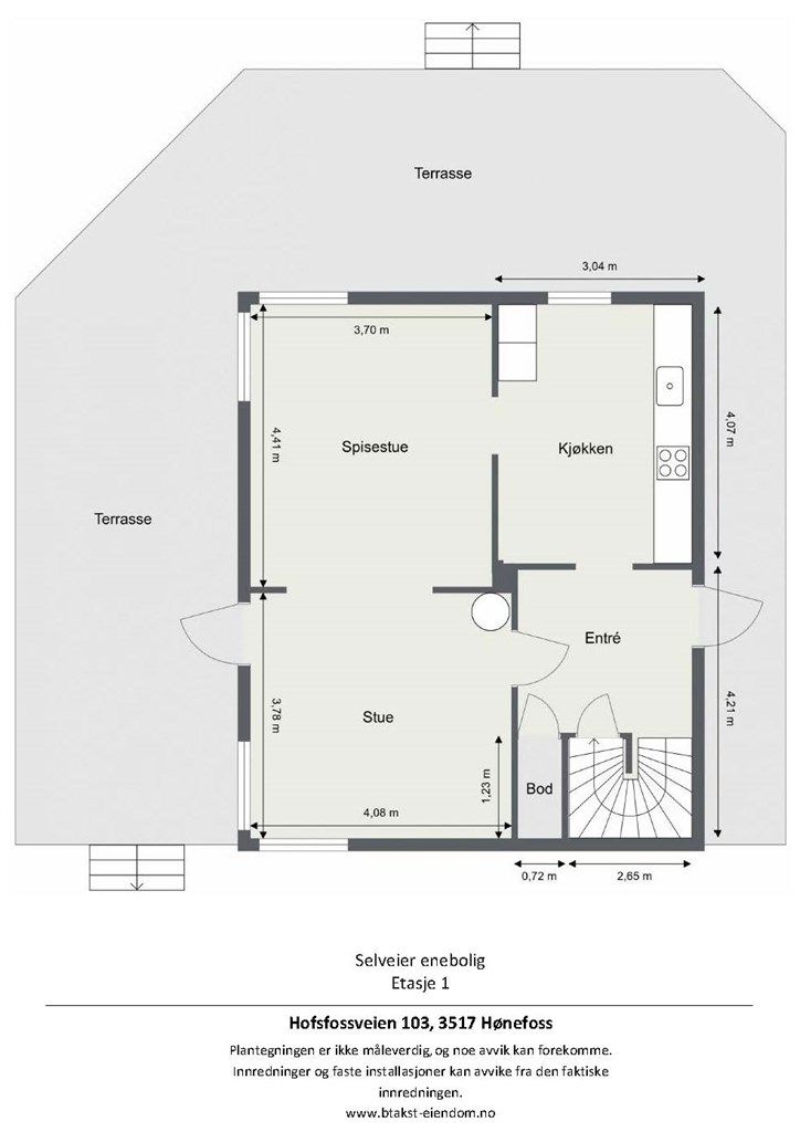 1. etasje 58 kvm: Entré, stue, spisestue, kjøkken og bod.