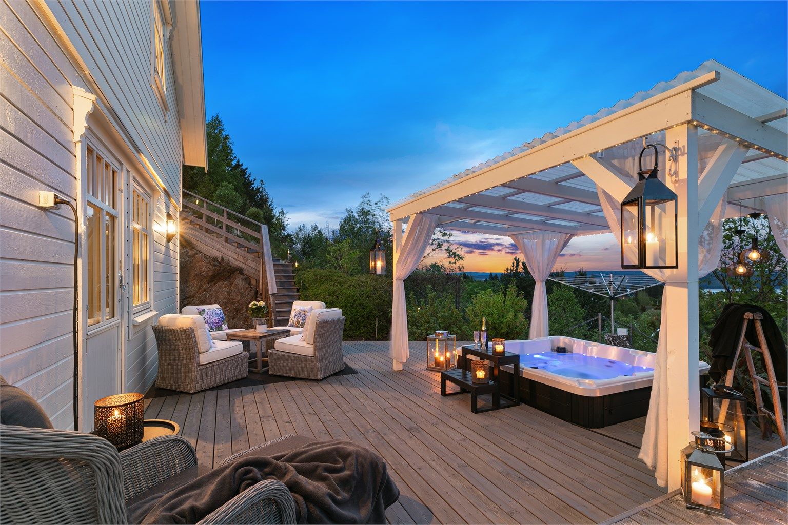 Fra 1.etasje har man utgang til hele 97 kvm. solrike terrasser, inndelt i ulike soner. Nyere del av terrassen har nedfelt jacuzzi, og det er bygget ny pergola.