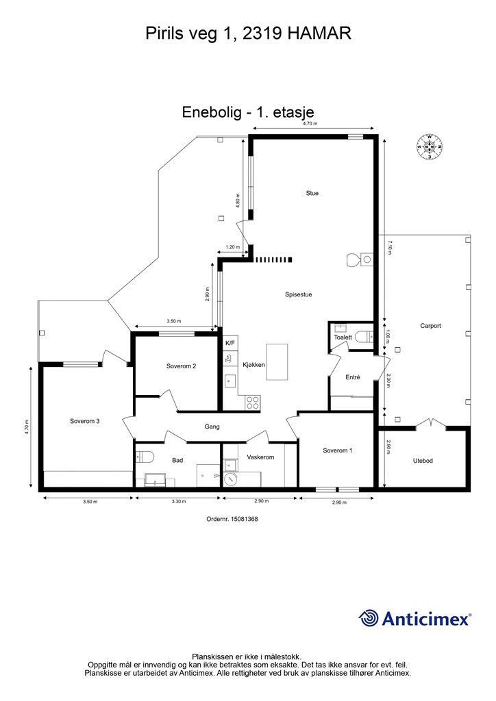 Vedlagte plantegninger er ikke målbare. De oppgitte arealer er hentet fra rapport med befaringsdato 17.04.2026 utført av Anticimex v/Pål Granseth Aasbakken . Arealene er beregnet og rom er definert etter dagens faktiske bruk, uavhengig av hva som er godkjent av bygningsmyndighetene.