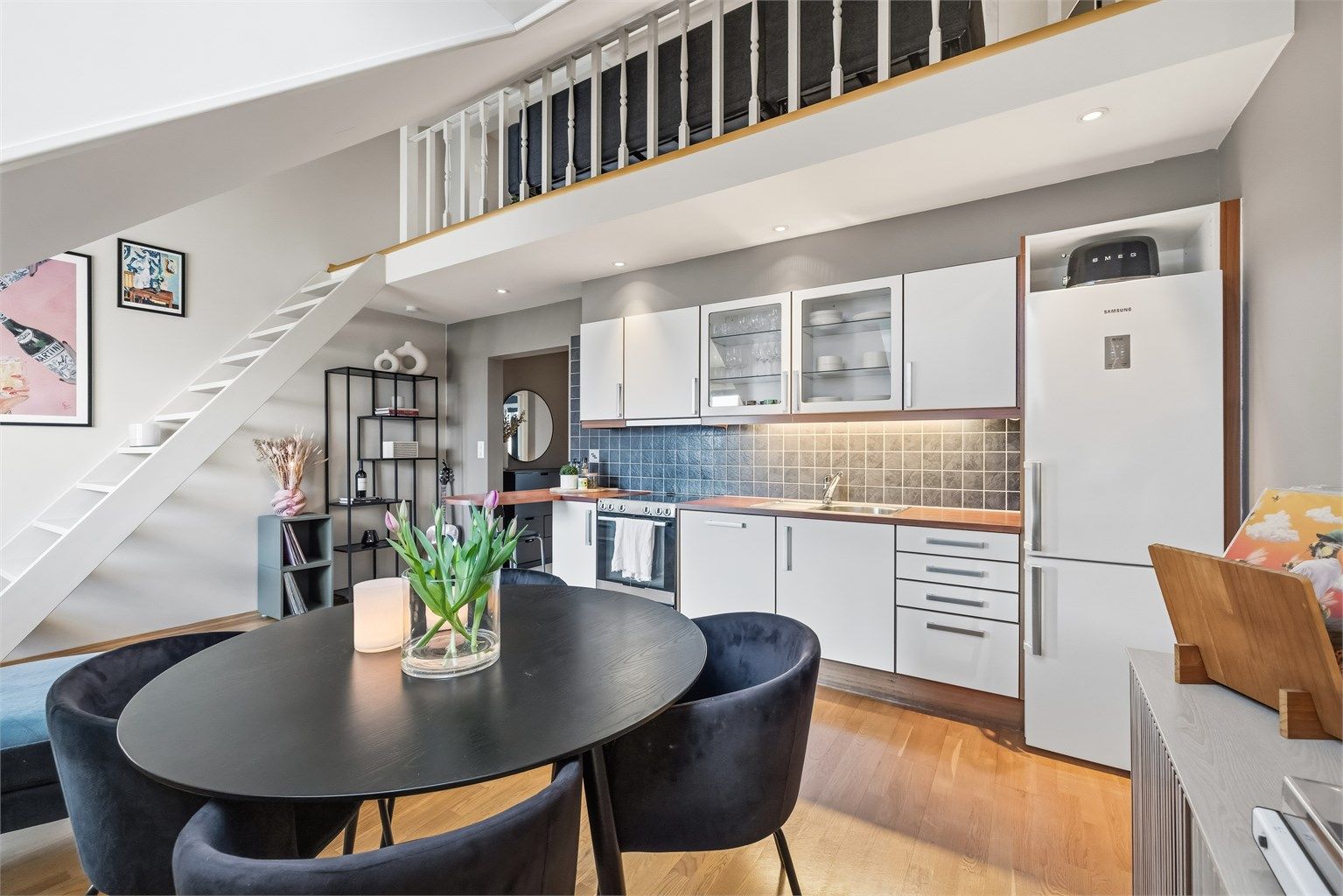 Åpen stue og kjøkkenløsning med kjøkken av god størrelse og rikelig med skap og benkeplass. Her er det god plass til matlaging og sosiale kvelder. Kjøkkenet har en halvøy som passer perfekt til dagens mindre måltider eller ved sosiale kvelder. God plass til spisebord og en sofa. Hvitevarer på kjøkken medfølger og det må forventes noe slitasje på disse. Videre er det trapp opp til hems med gulvareal på hele 21 kvm som benyttes som en ekstra stue/hjemmekontor av dagens eier.
