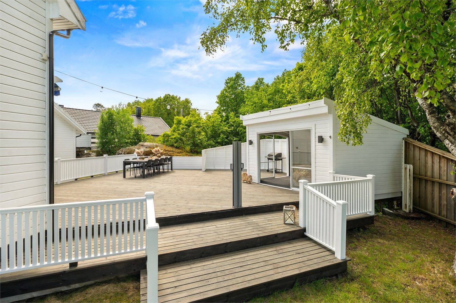 Innholdsrik og praktisk planløsning, og stor tomt med terrasse på 90kvm med utestue. Hagen er solrik og skjermet og har rikelig med plass for utemøblementer og sosialt samvær.