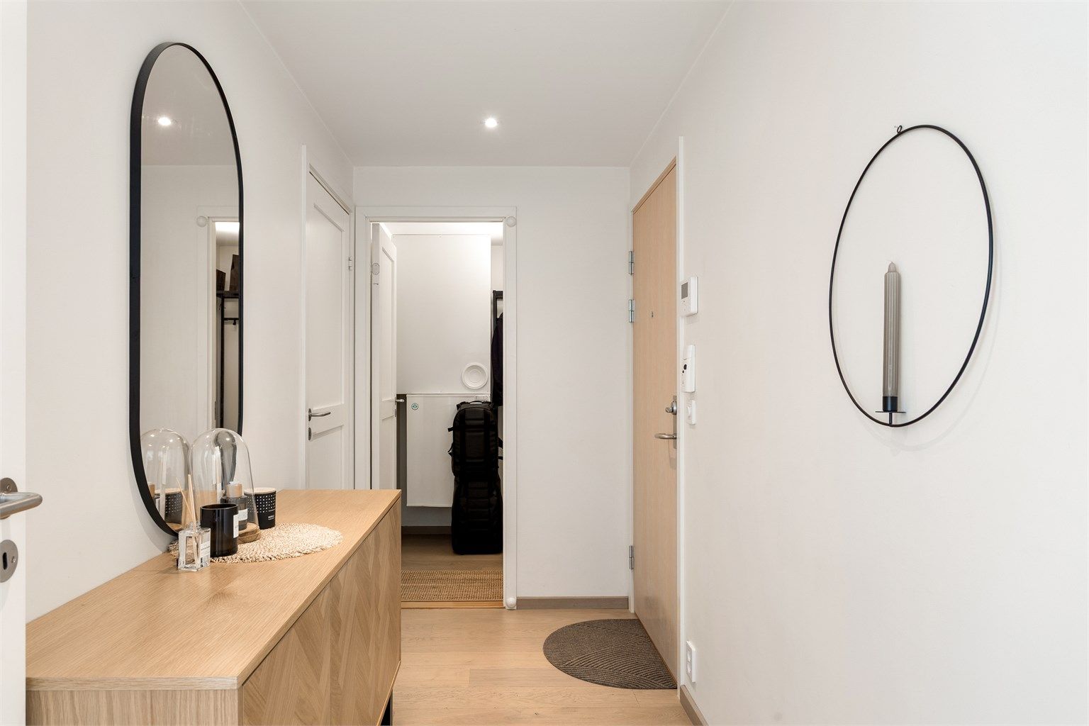 En lys og innbydende entré gir et godt førsteinntrykk. Her er det plass til oppheng av yttertøy og oppbevaring av sko, og løsningen oppleves både praktisk og ryddig. Fra gangen er det adkomst til en innvendig bod, som gir ekstra lagringsplass i hverdagen.