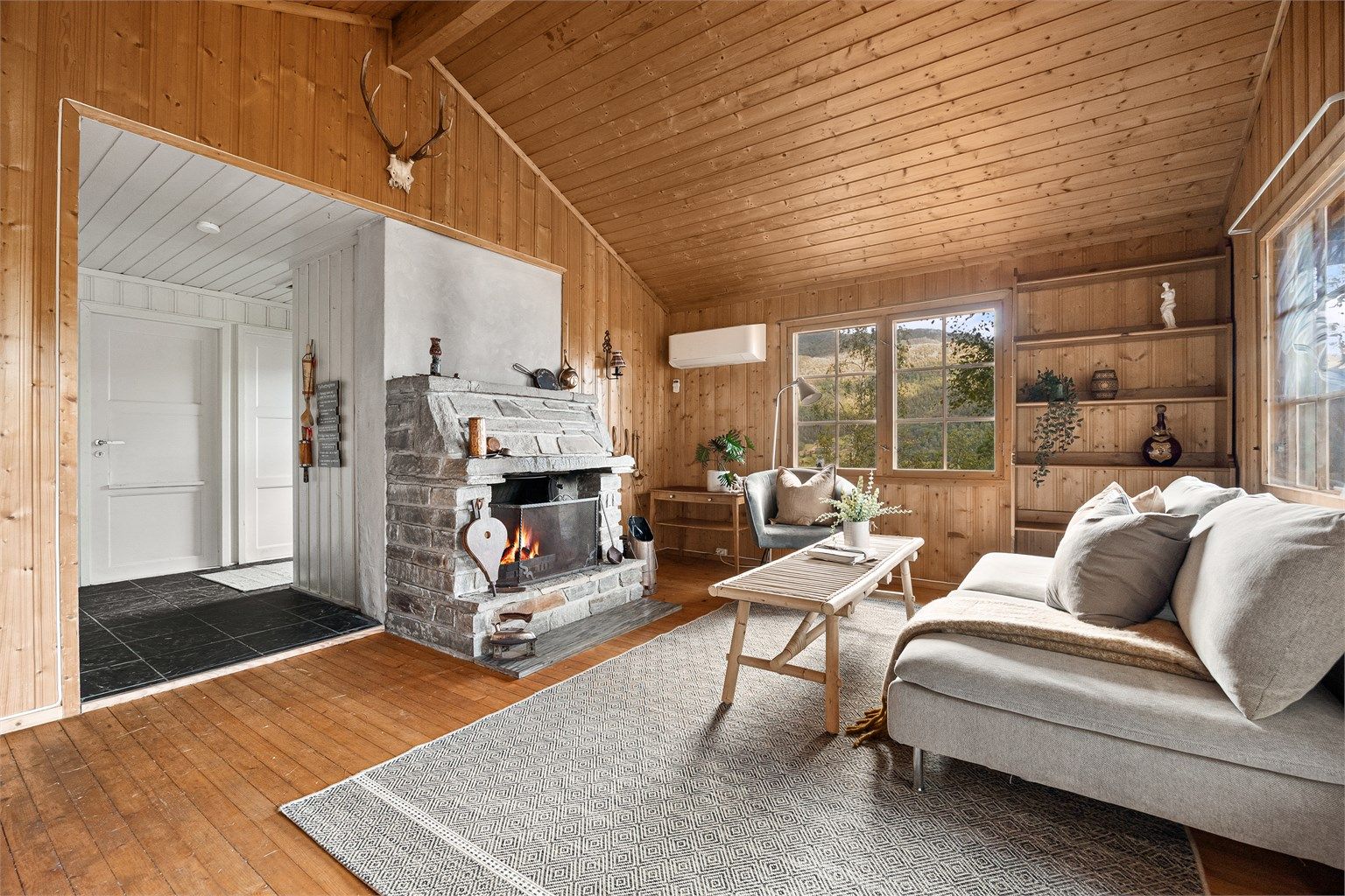 Hytten har en effektiv planløsning med entre, stue, kjøkken og 2 soverom.