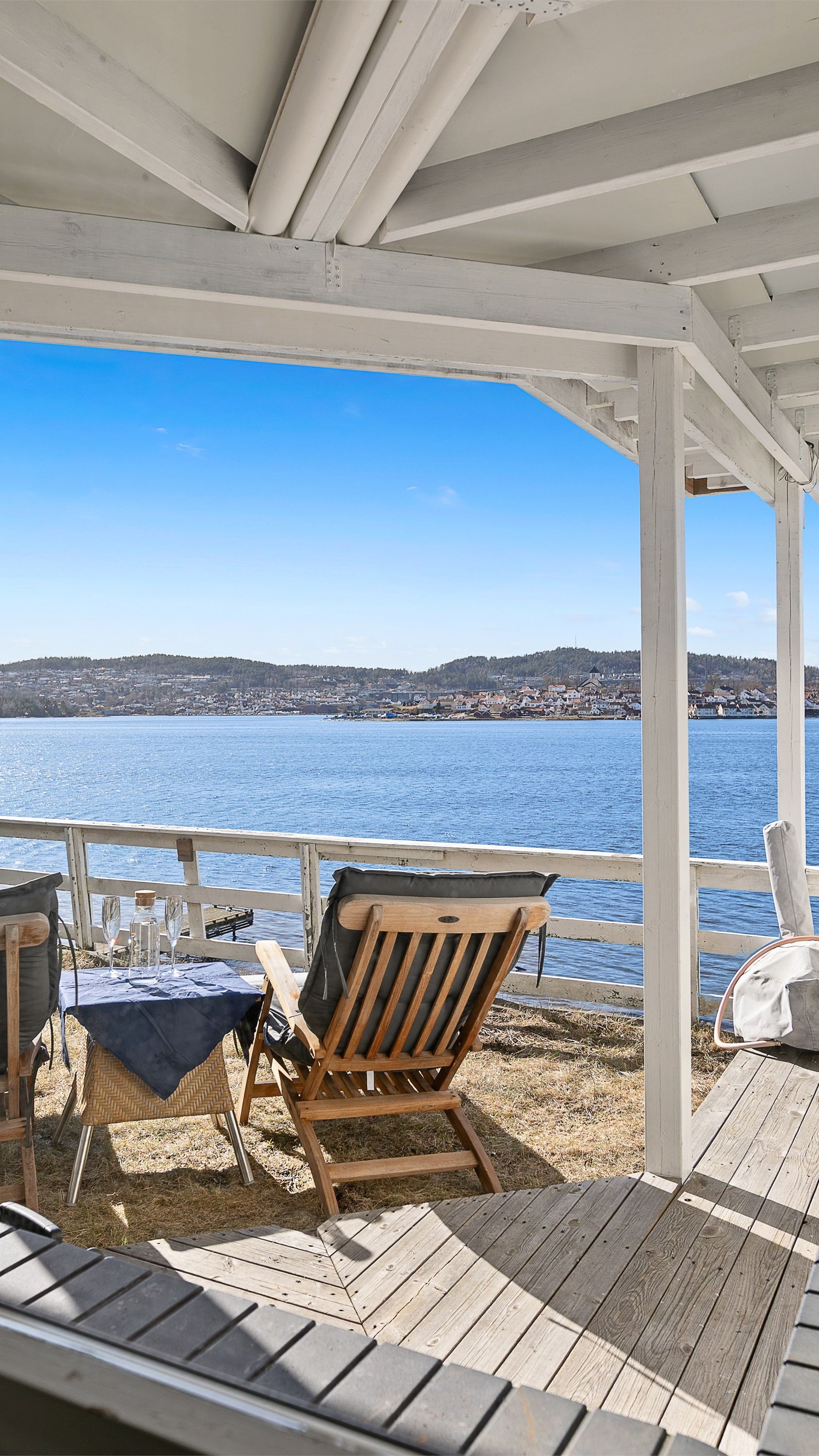 Skjærgårdsidyll med sen kveldsol og utsikt mot Brevik. Brygge og fin sandstrand rett nedenfor hytta.