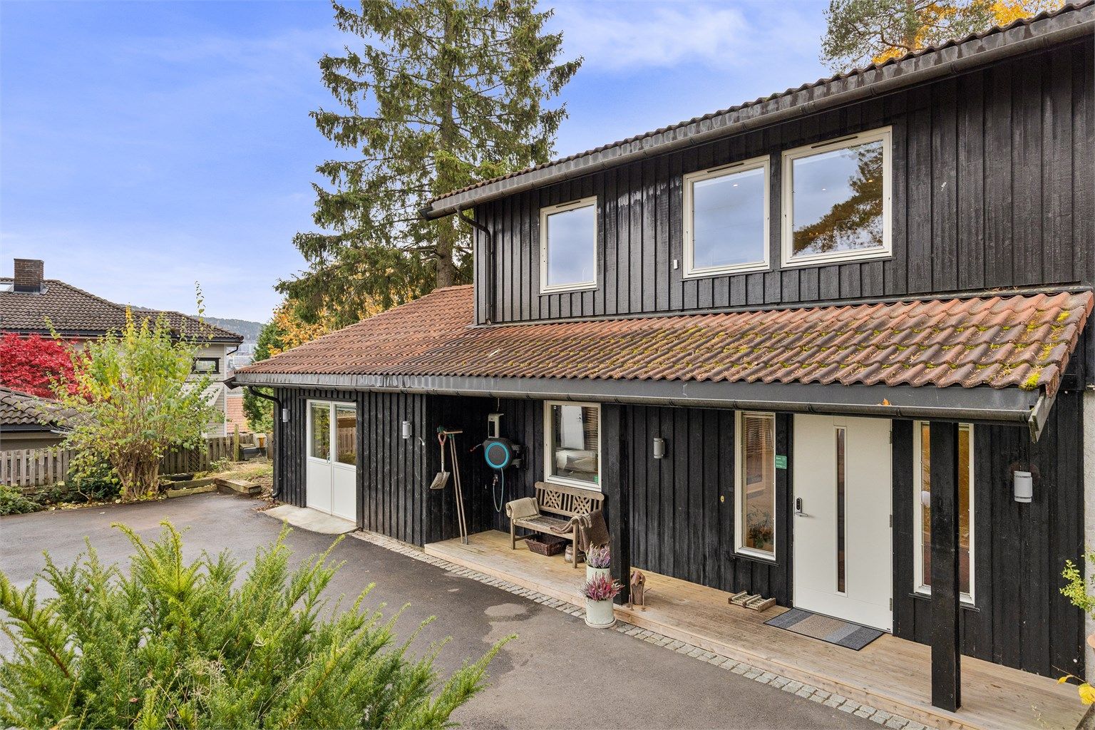 Boligen har stor hage og flere fine uteområder. Carport for en bil og garasje med port. Ladepunkt for el-bil er montert på husvegg.