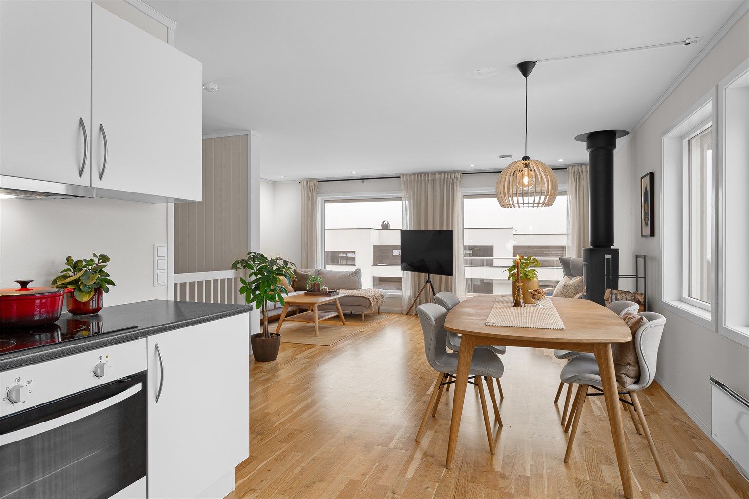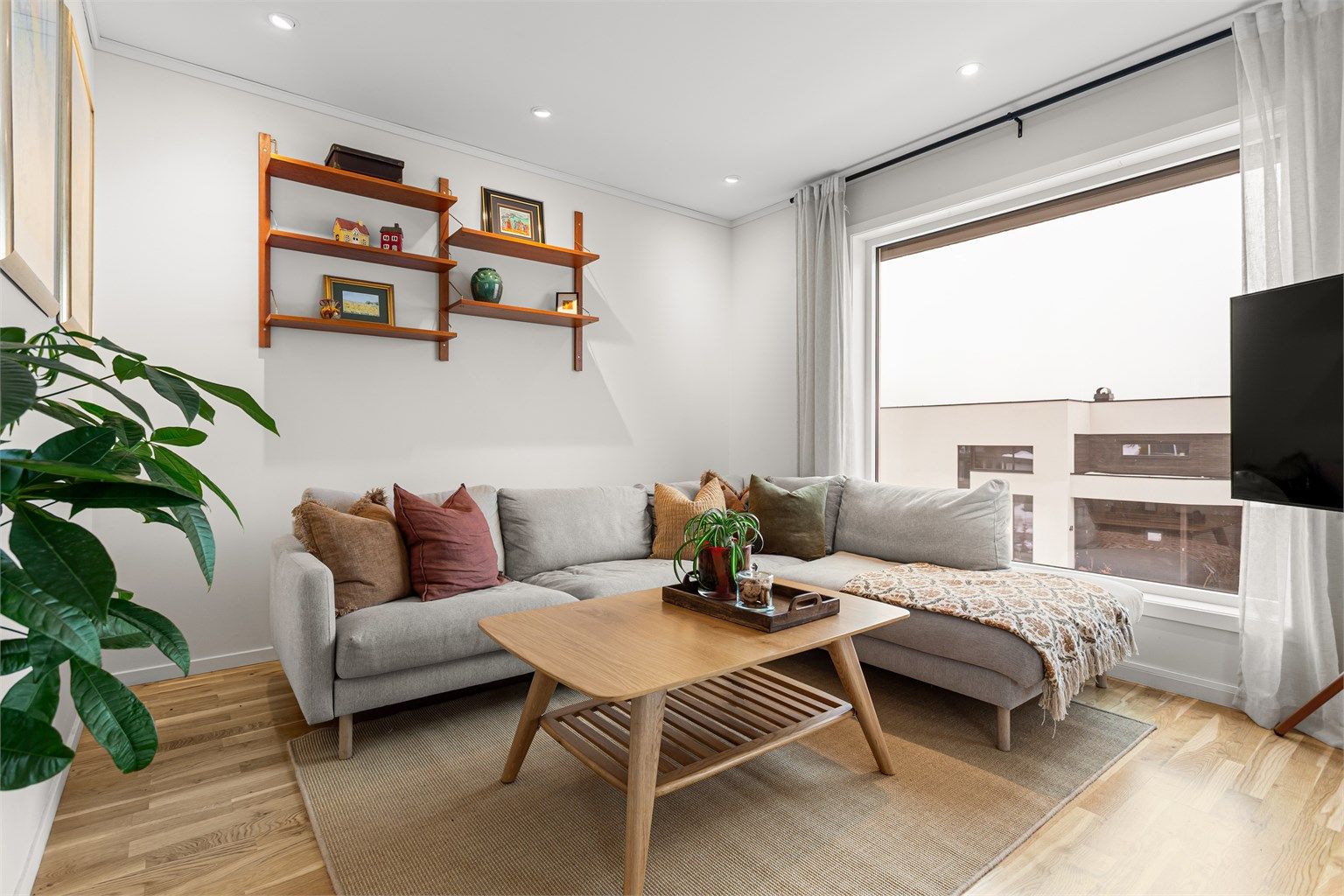 - Lys stue med mye naturlig lys fra store vindusflater