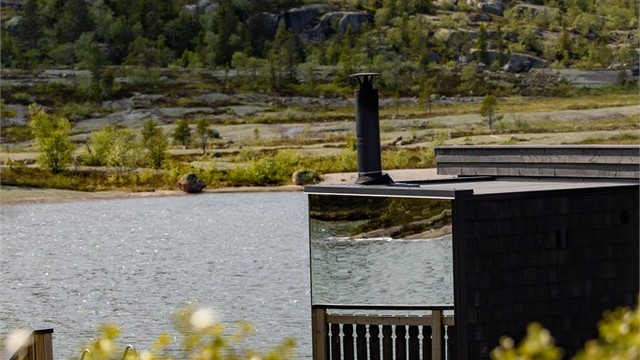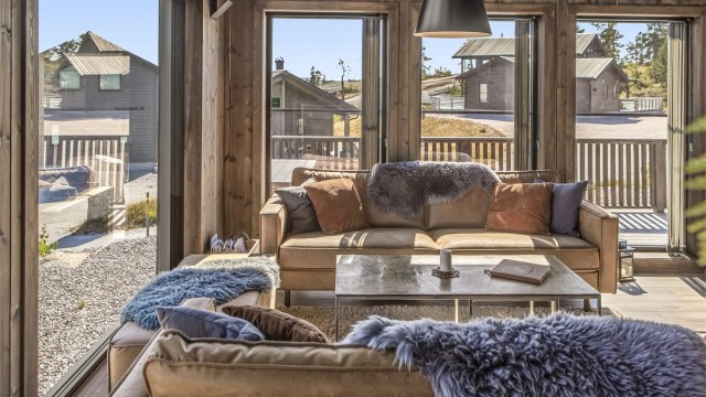 Den åpne kjøkken- og stueløsningen er hyttens hjerte, med vindusflater fra gulv til tak som gir panoramautsikt uansett hvor du oppholder deg i rommet. I tillegg sørger en peisovn av merket Heta for varme og koselig stemning på kalde vinterkvelder.