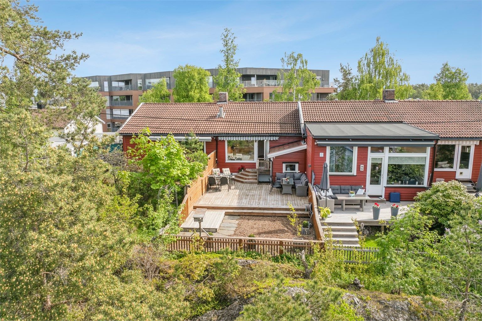 Boligen har gode solforhold med morgensol inn på kjøkken og soverom og sol hele dagen og utover kvelden på terrassen og hagen som innbyr til lek og rekreasjon.