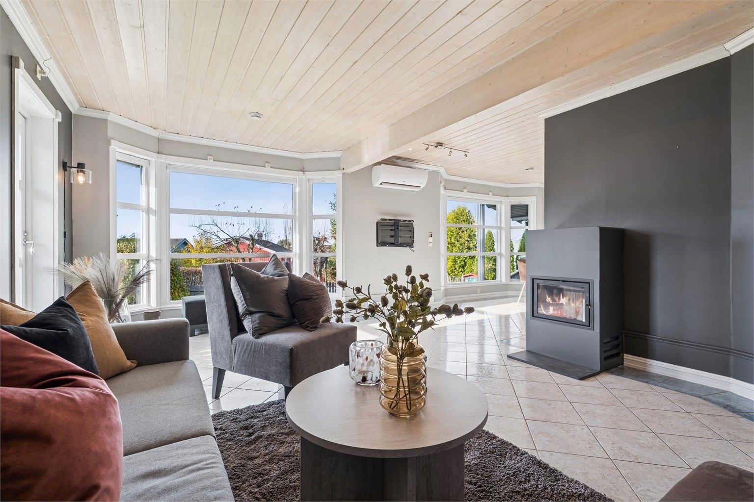 Boligen inneholder i 1. etasje gang, entré, stue/spisestue, kjøkken, baderom og rom. Fra stue er det utgang til en romslig terrasse med plass til flere møbleringssoner. 2. etasje inneholder stue, 2 soverom og balkong med adkomst fra det ene soverommet. Underetasjen med utleiedel som har egen, privat adkomst og inneholder entré, gang, stue, kjøkken, soverom og teknisk rom. Parkering i dobbelgarasje samt plass til øvrig parkering på tomten.