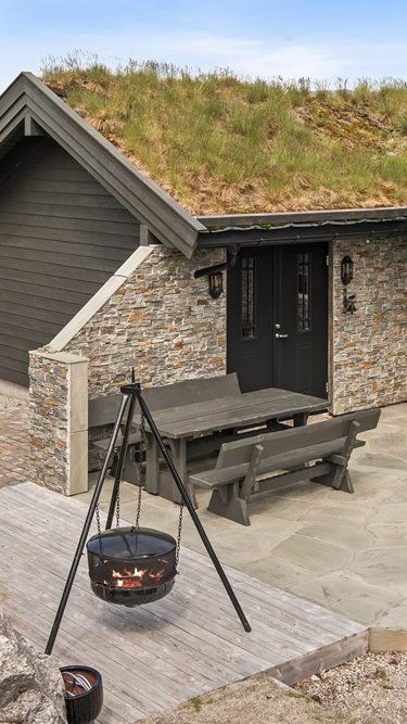 Utendørs områdene er pent opparbeidet med uteplasser hvor det er skifer. Passer fint inn i de naturlige omgivelsene og er meget lettholdt. Det er fin plass både ved inngangspartiet og utfra kjøkkenet, slik at man kan flytte seg med sol, vær og vind.