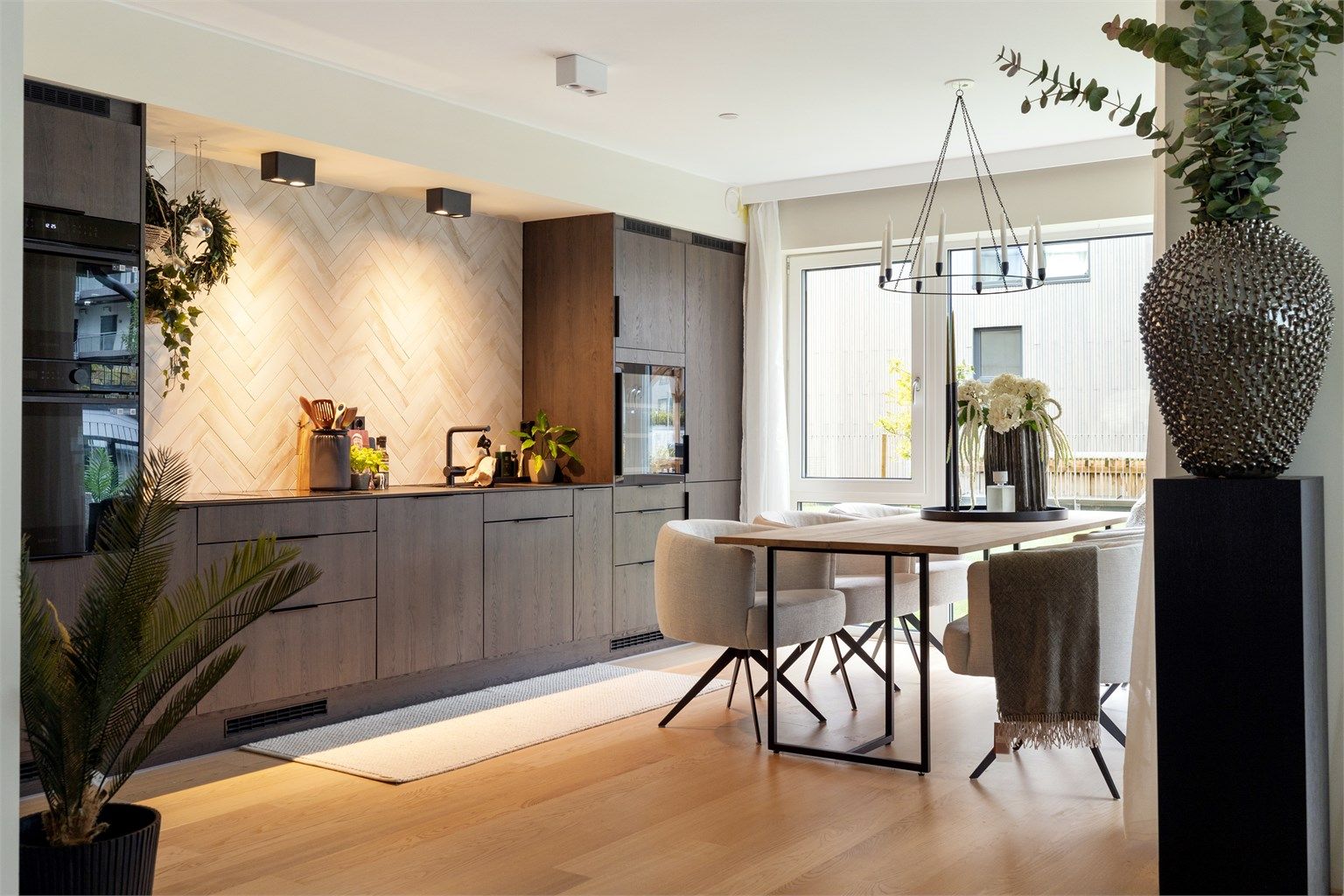 Kjøkken: Moderne og stilrent kjøkken som bør tilfredsstille de fleste sine behov. Norema kjøkkenet har innredning med glatte fronter og benkeplate av stein. Det er kjøl/fryseskap, oppvaskmaskin, platetopp med benkeventilator, micro med stekefunksjon, stekeovn/steamovn, vannstoppsystem, vinskap og komfyrvakt. Store vinduer gir rikelig med lys og gode arbeidsforhold ved matlaging.