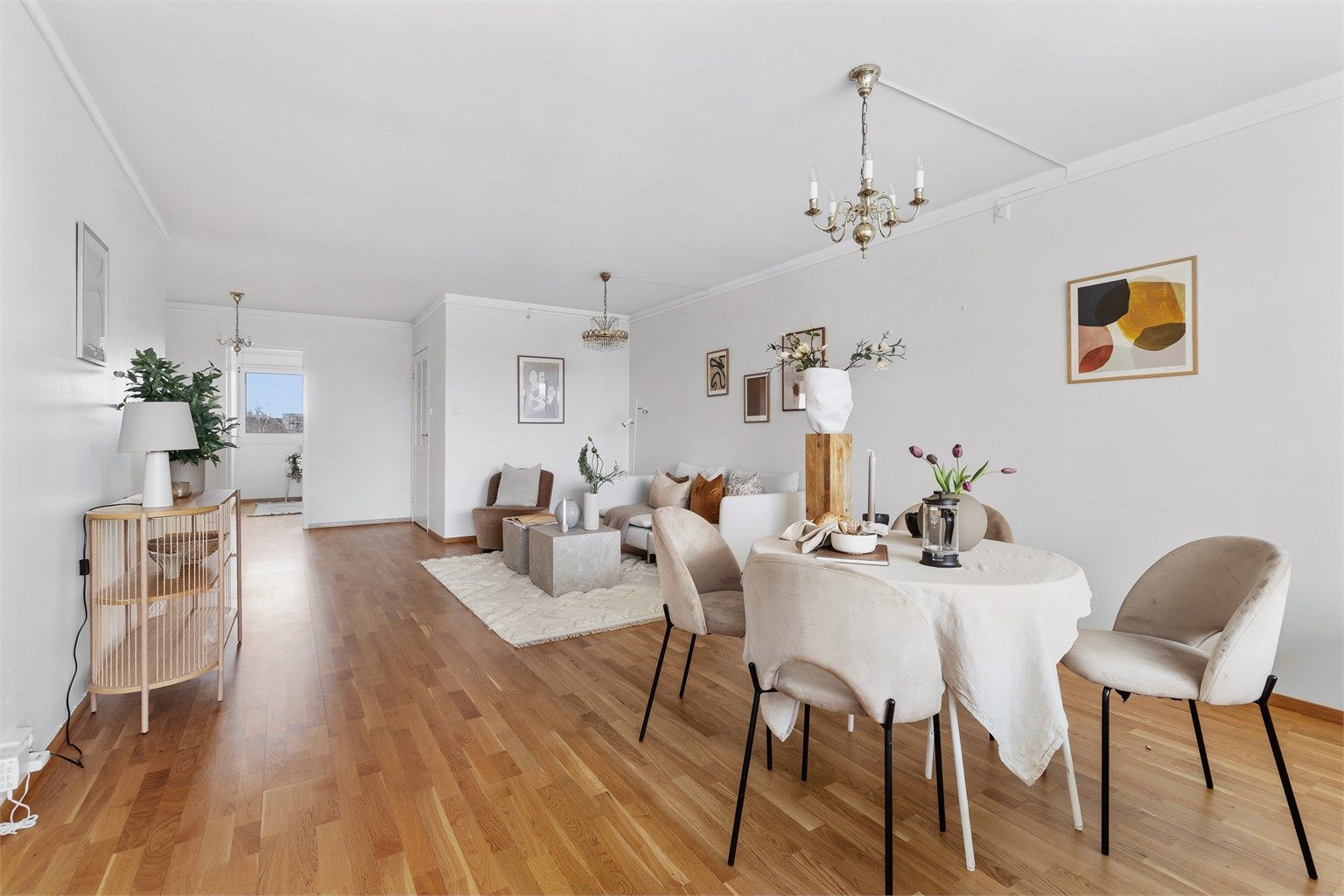 Stuen fremstår som svært romslig og gjennomgående lys, med store vindusflater som gir en åpen og luftig atmosfære. Her er det rikelig med plass til både sofagruppe og spiseplass, og den åpne planløsningen gir fleksible møbleringsmuligheter. De lyse flatene og den harmoniske utformingen gjør rommet lett å innrede etter egen stil.