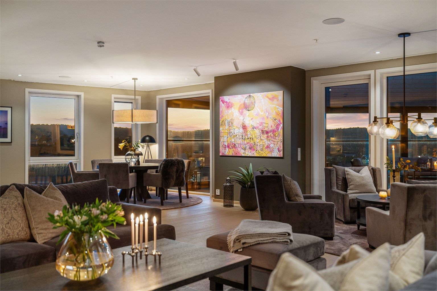Det sjeldent store interne bruksarealet på hele 171 kvm. er i seg selv blant leilighetens fremste kvaliteter. En imponerende stue på 75 kvm. er strategisk plassert i byggets ende, der nær 180 grader vid utsikt sees. Stuen inneholder også et sømløst integrert og elegant kjøkken fra den anerkjente kvalitetsprodusenten Sigdal, med smart barløsning.
