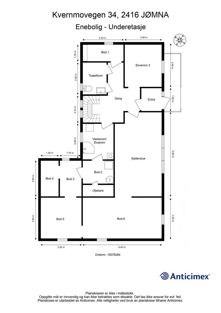 Kjeller: 123 kvm: Entré, gang, soverom, toalettrom, vaskerom/dusjrom, kjellerstue og seks boder.